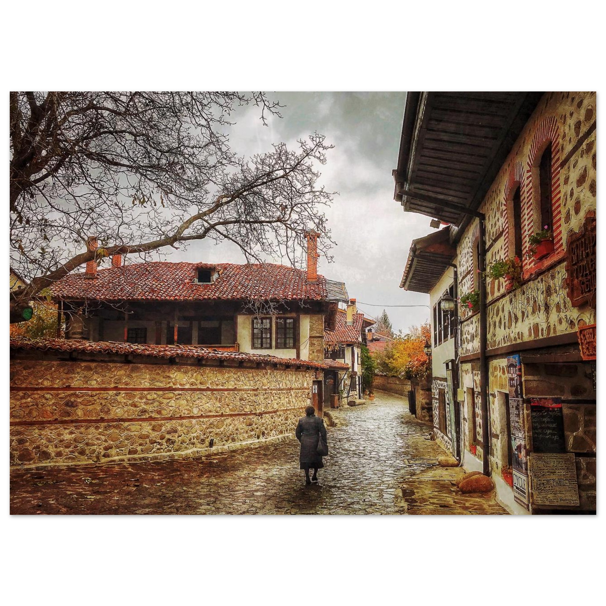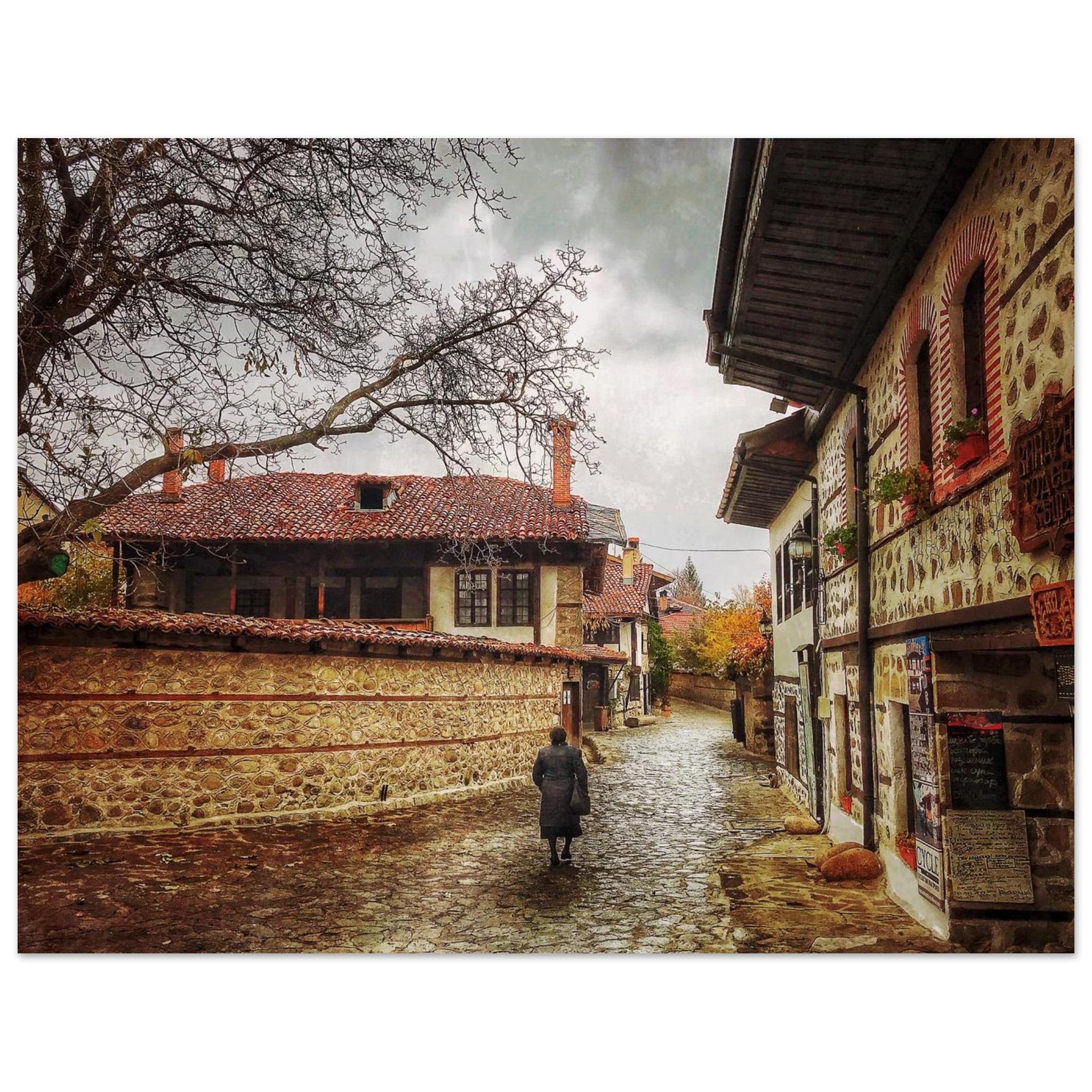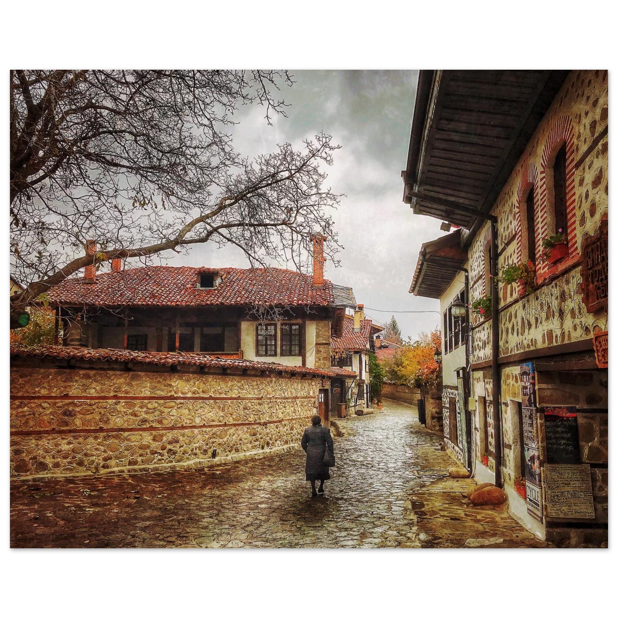 Step into a scene of timeless charm with this captivating image of a historic Bulgarian alleyway. Evoking a sense of quiet wonder and old-world beauty, this premium matte paper poster captures the essence of a tranquil moment in a European town, complete with cobblestones and rustic architecture under a soft, cloudy sky.