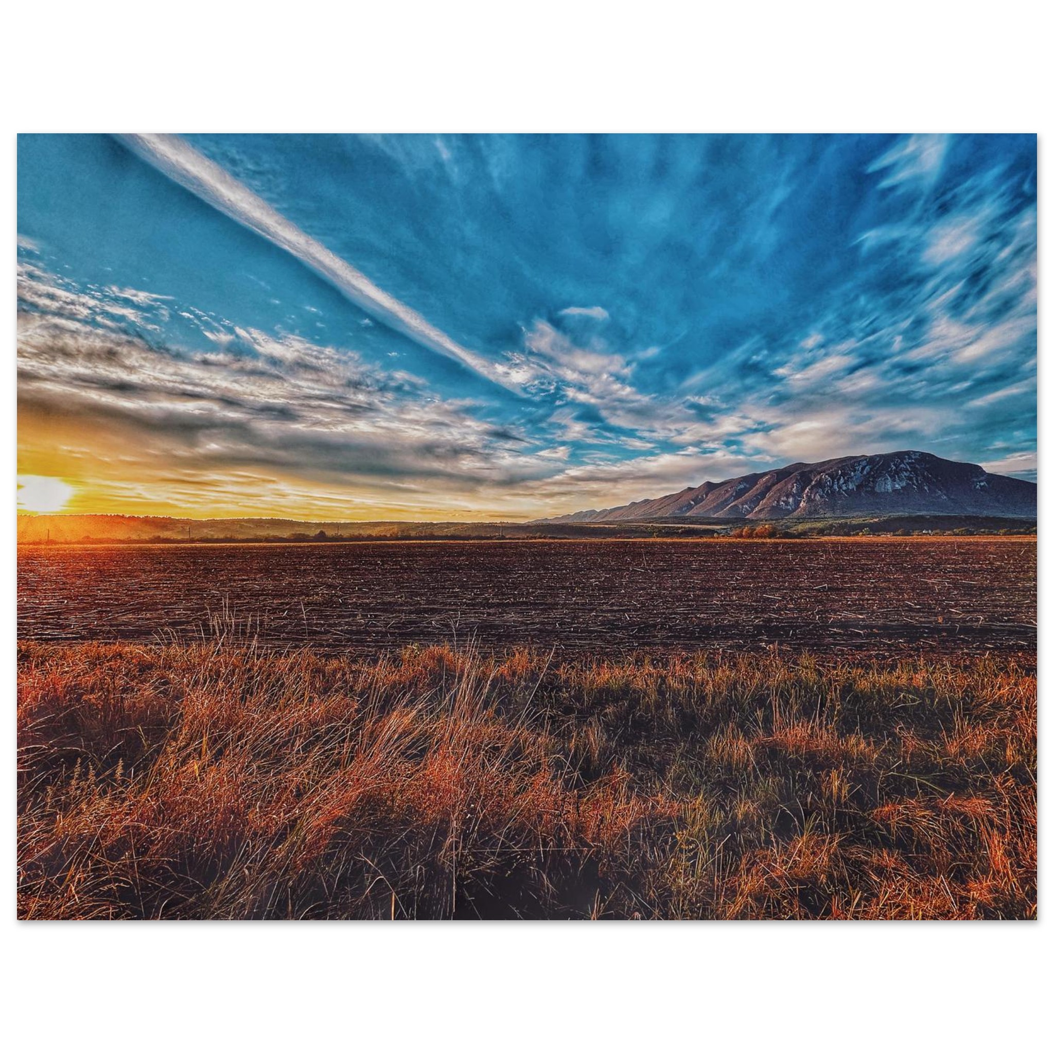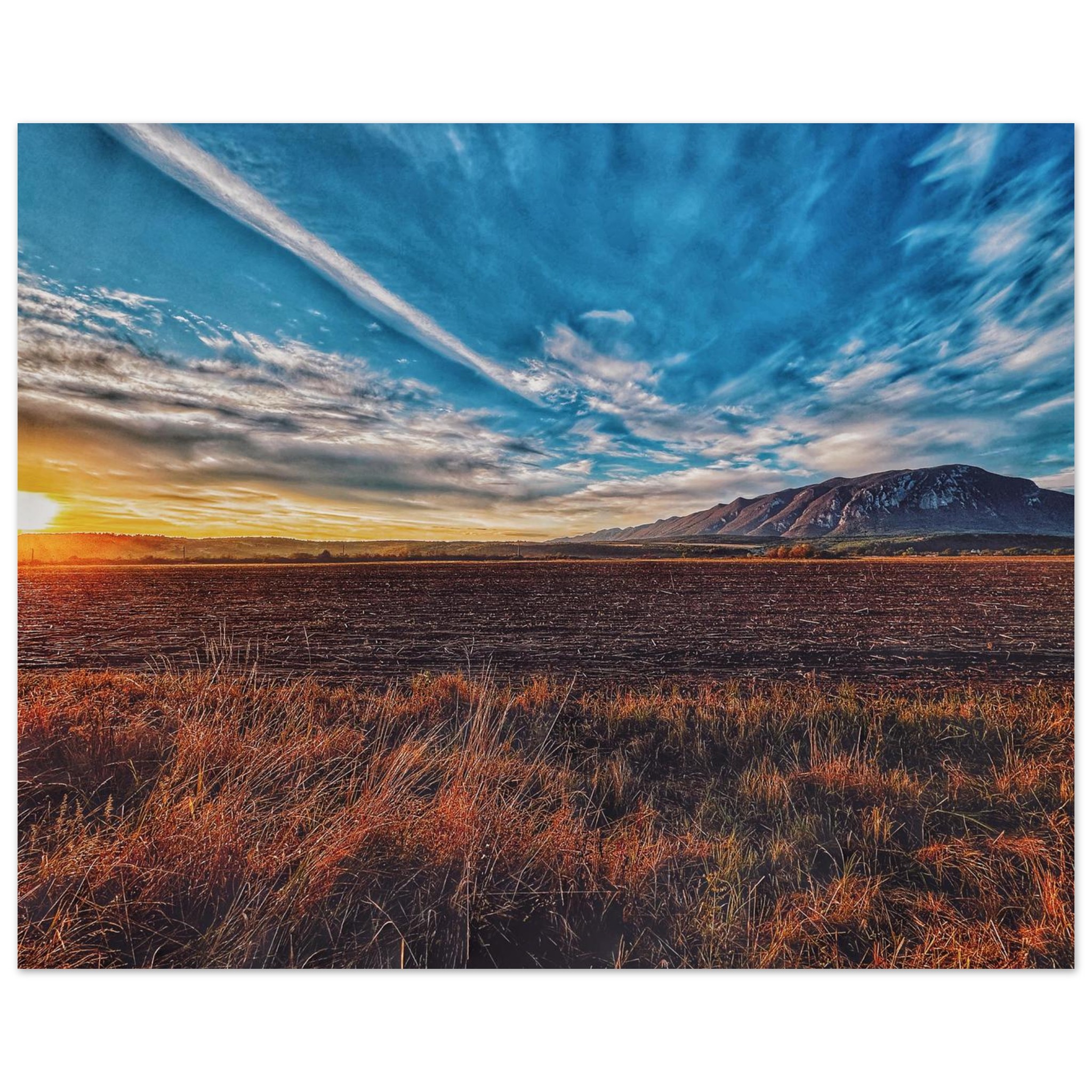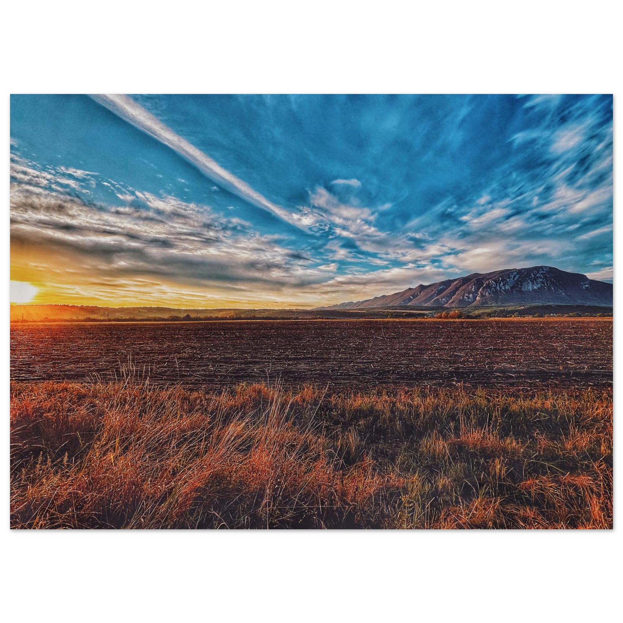 Immerse yourself in the breathtaking beauty of a Bulgarian Balkan mountain sunset, captured with stunning vibrancy. This premium matte paper poster brings the dramatic sky, rich golden hues, and serene landscape into your home, transforming any space with its evocative mood and striking color palette.