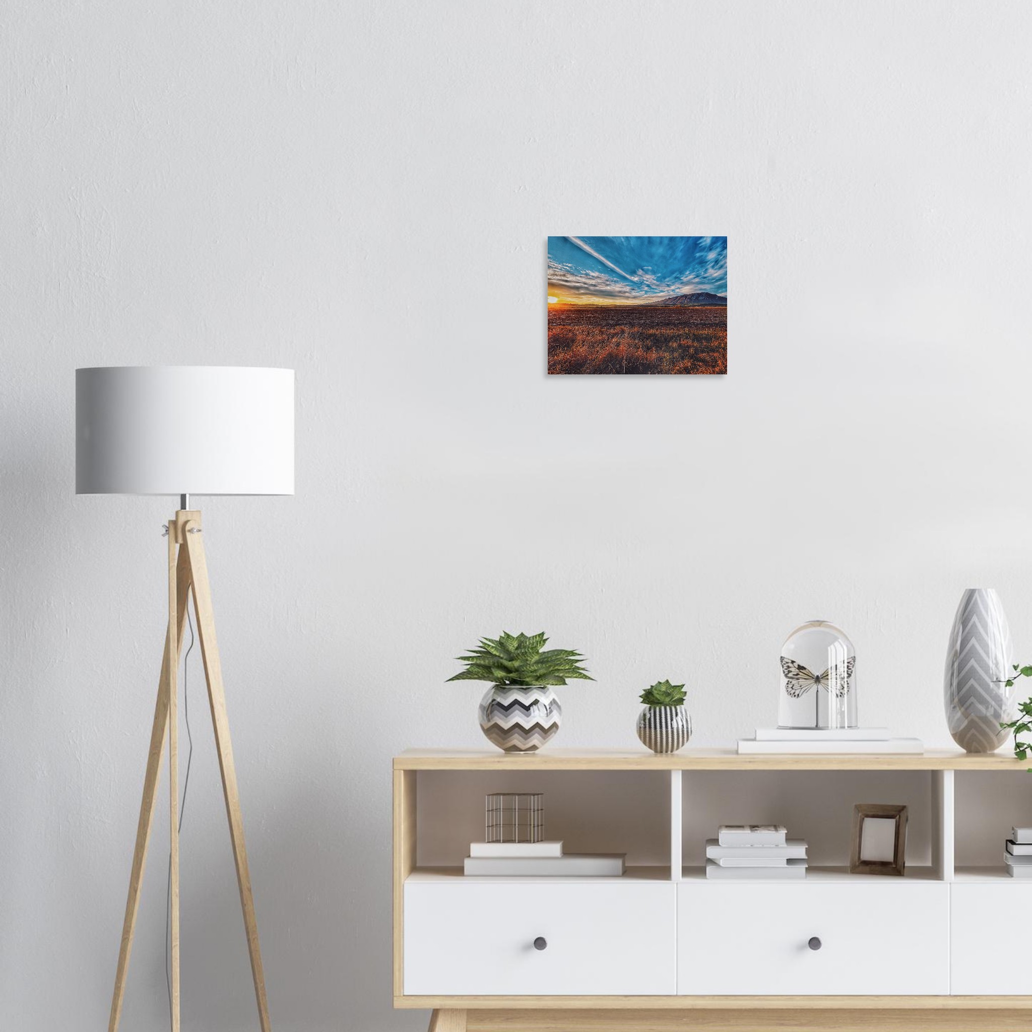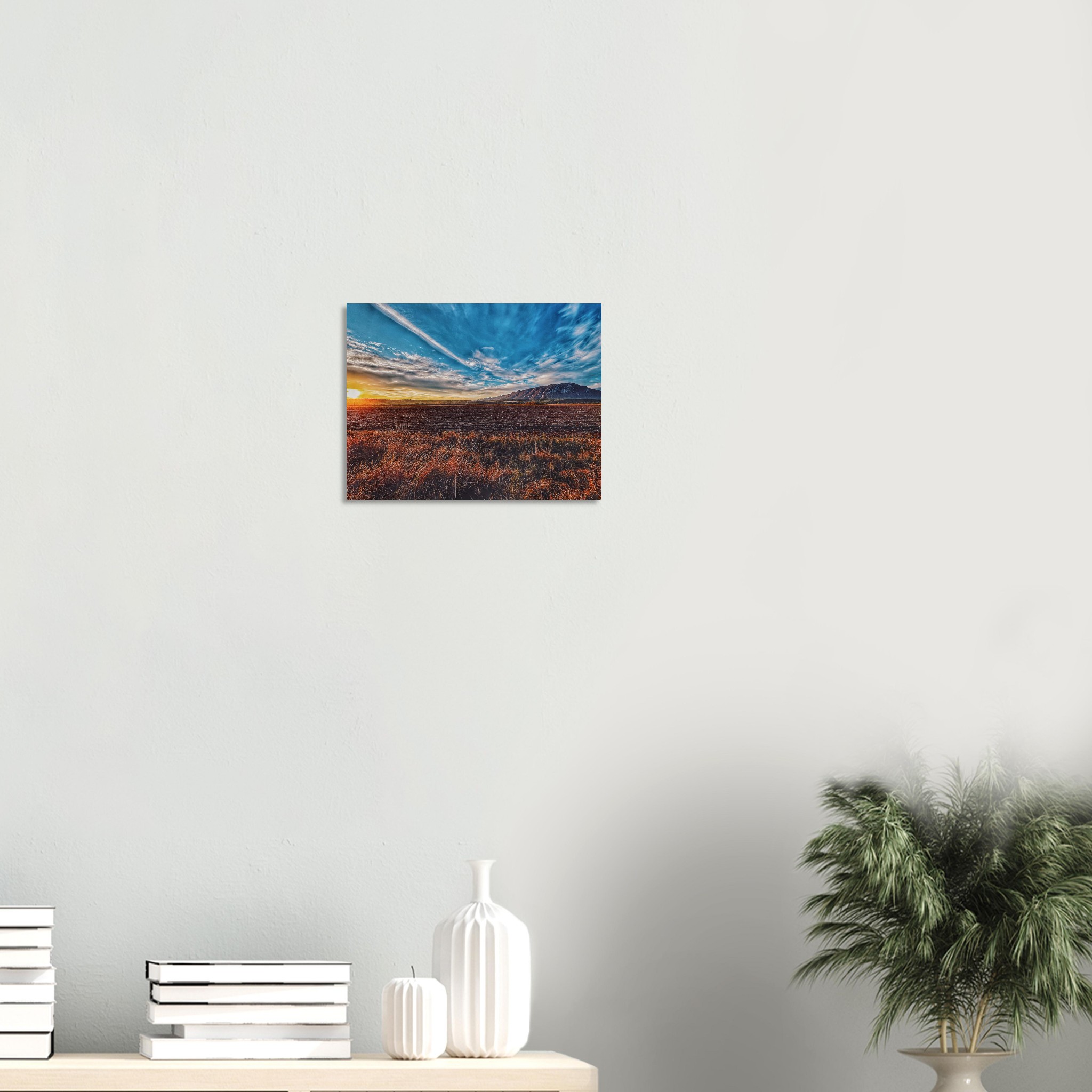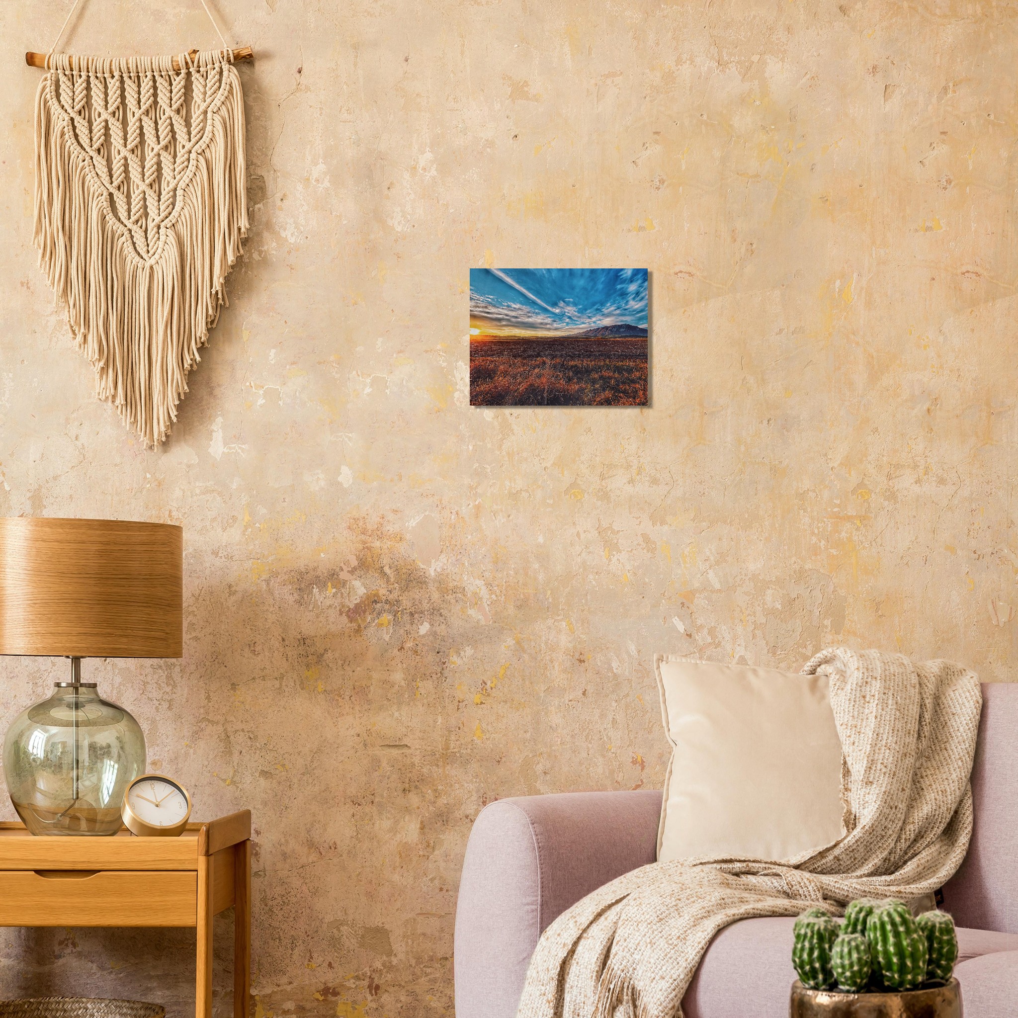 Immerse yourself in the breathtaking beauty of a Bulgarian Balkan mountain sunset, captured with stunning vibrancy. This premium matte paper poster brings the dramatic sky, rich golden hues, and serene landscape into your home, transforming any space with its evocative mood and striking color palette.