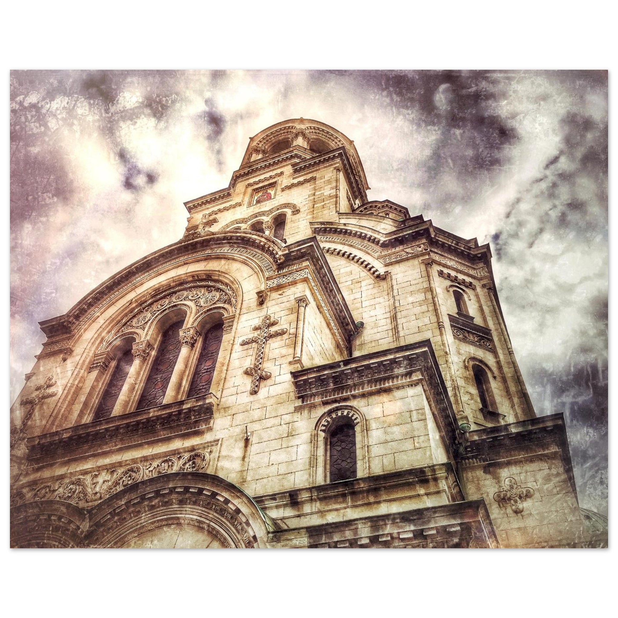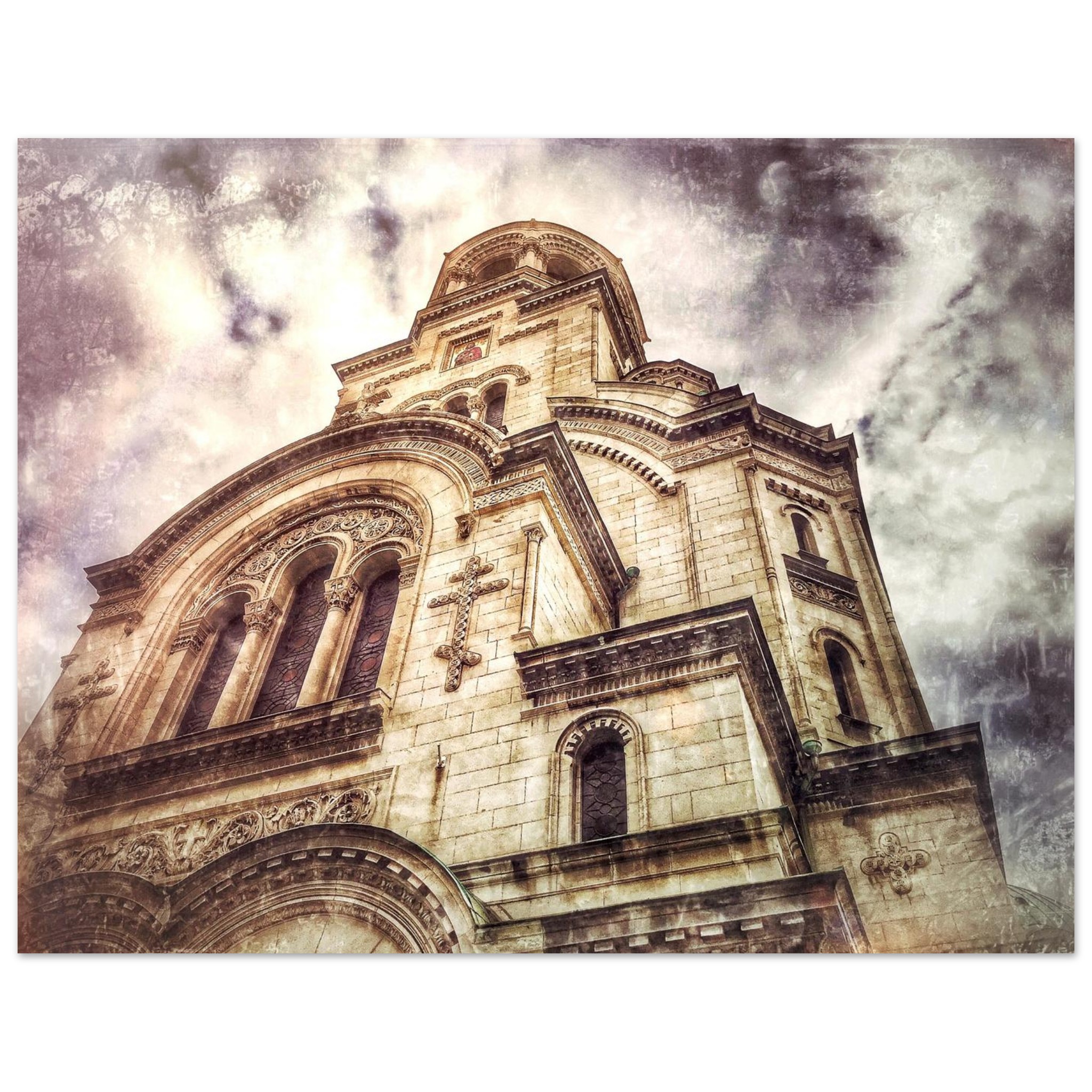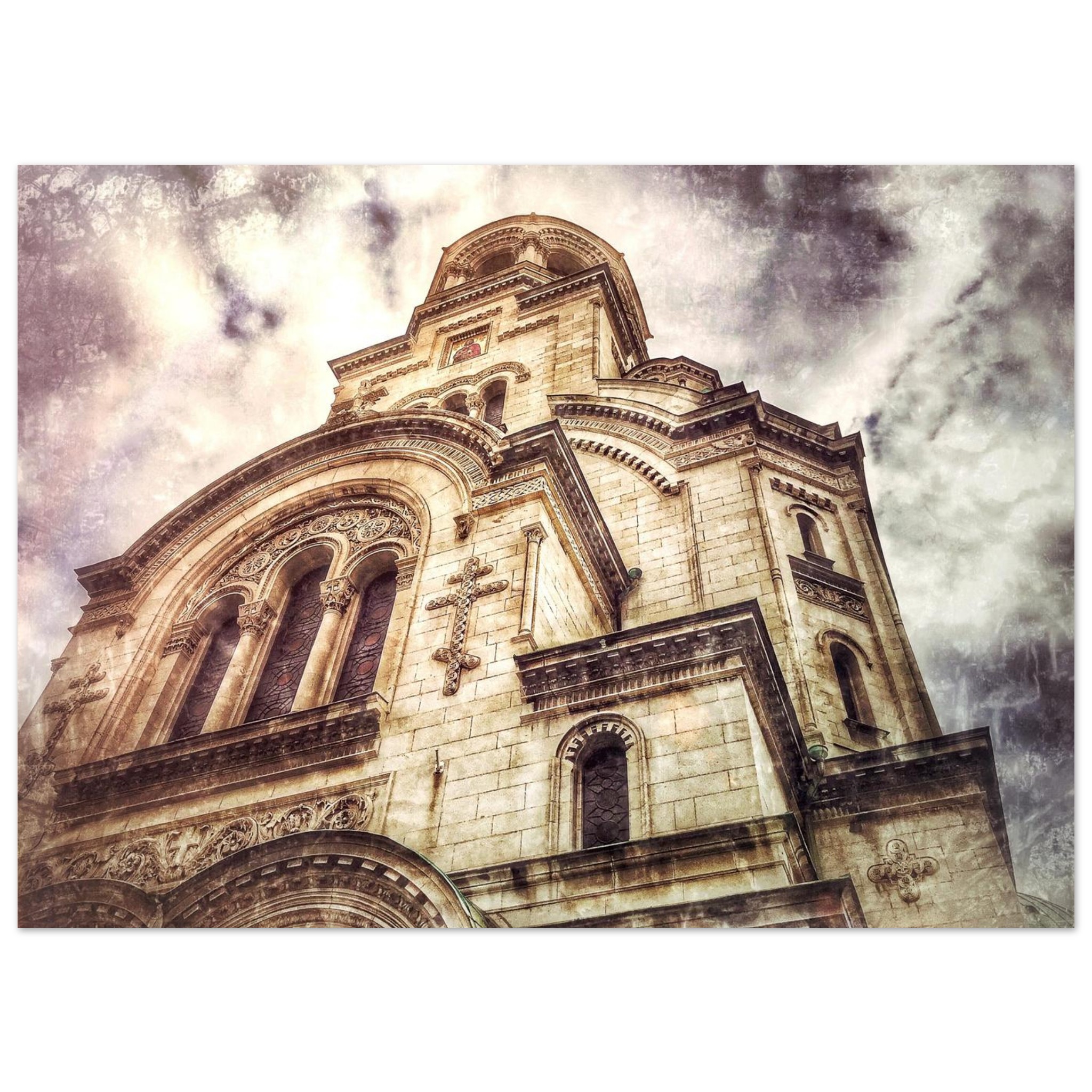Capture the timeless elegance of Bulgaria’s architectural heritage with this stunning premium matte poster. This artwork beautifully presents a grand cathedral, its intricate details and weathered charm brought to life against a dramatic, textured sky. The sepia tones and vintage-inspired finish evoke a sense of history and profound beauty, making it a perfect statement piece for any space.