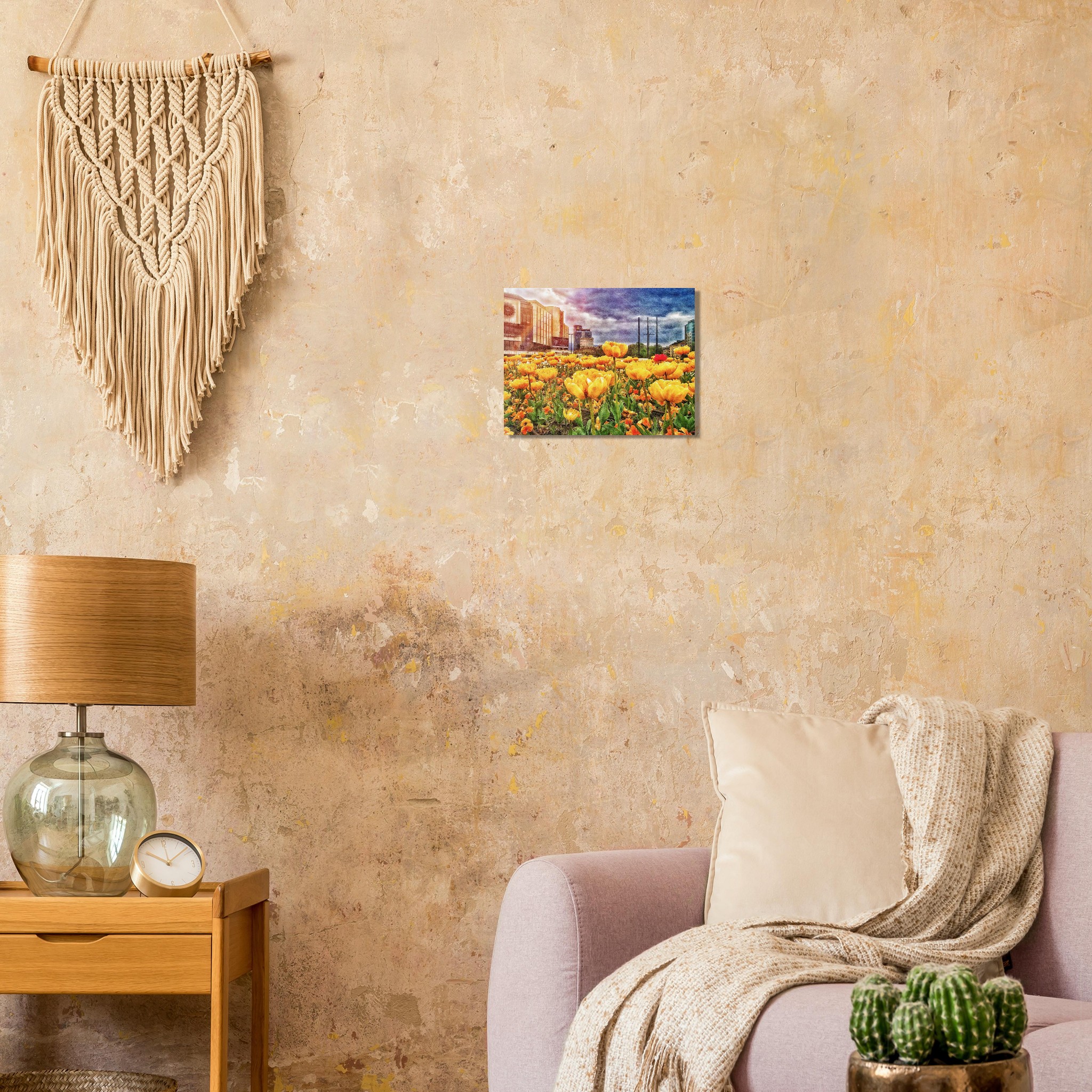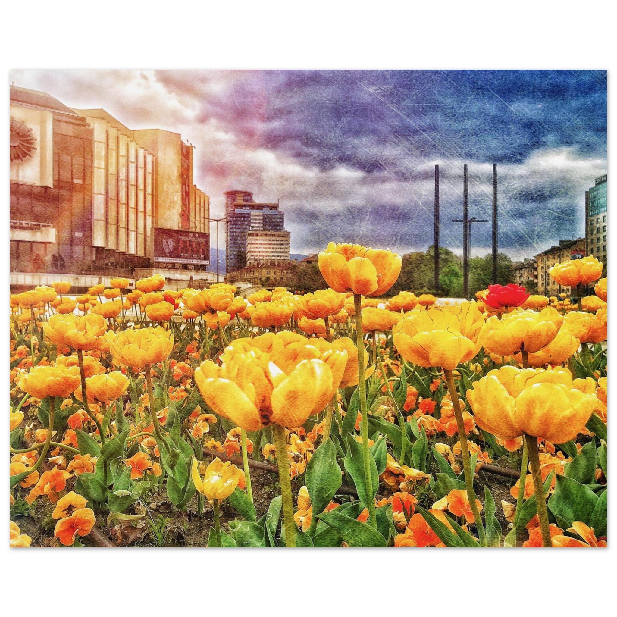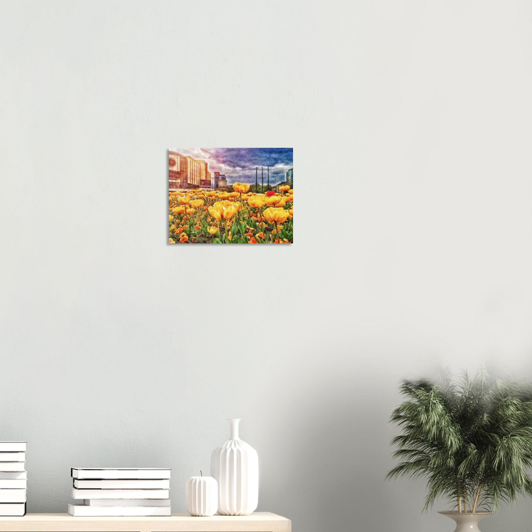 Immerse yourself in the vibrant energy of a city in full bloom. This stunning art print captures the joyful spectacle of golden tulips, with a single striking red bloom, set against a dynamic urban backdrop under a painterly sky. It’s a celebration of nature’s resilience and beauty thriving amidst modern architecture, perfect for adding a touch of sophisticated cheer to any room.