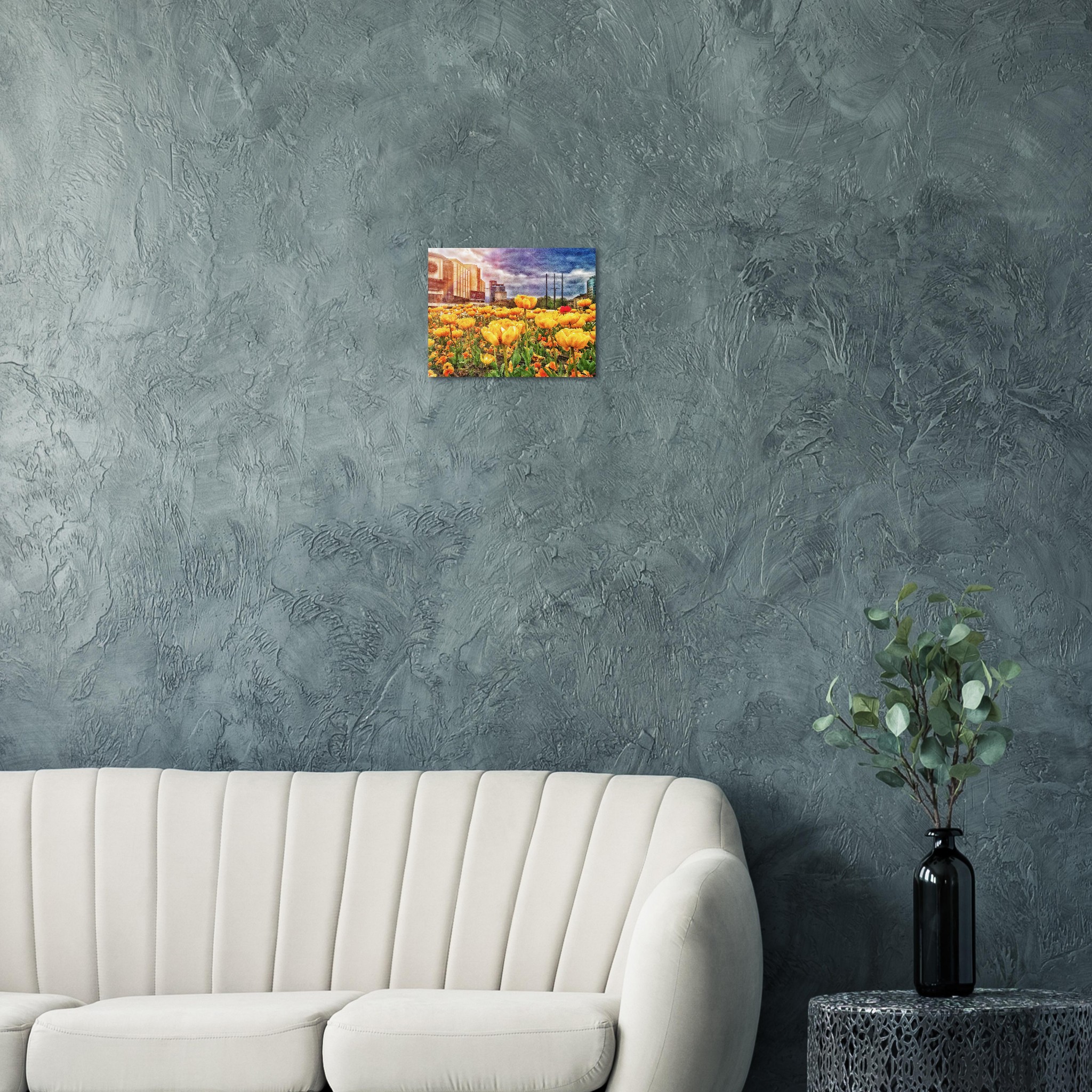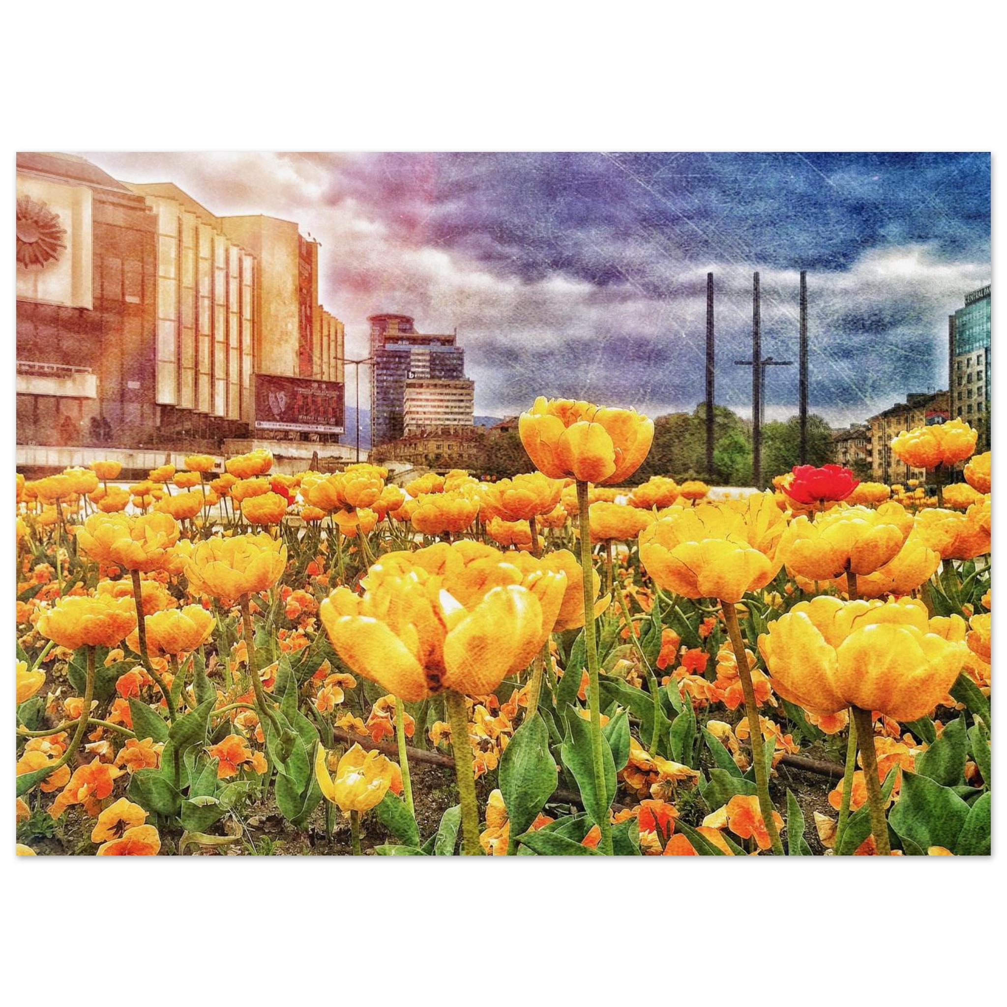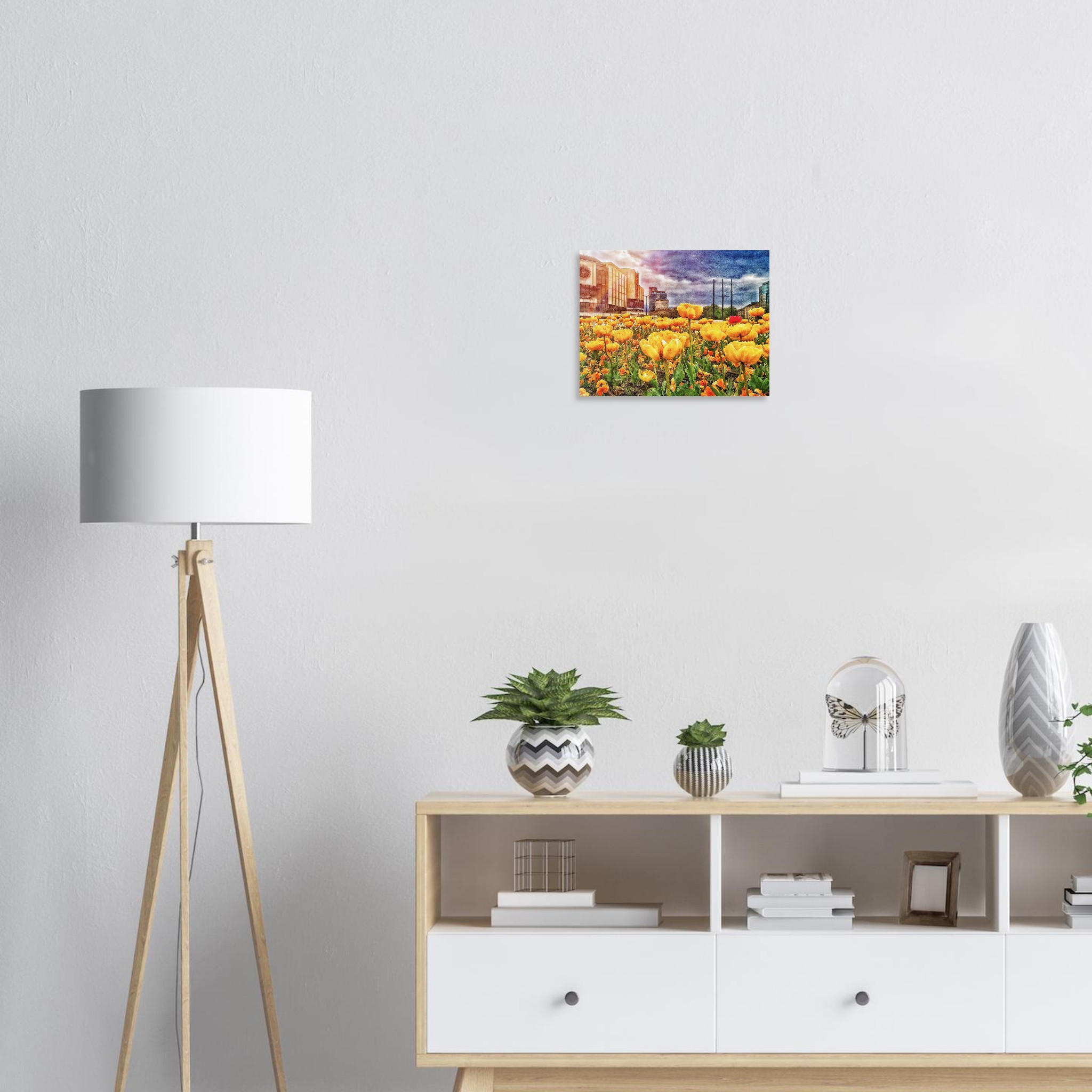 Immerse yourself in the vibrant energy of a city in full bloom. This stunning art print captures the joyful spectacle of golden tulips, with a single striking red bloom, set against a dynamic urban backdrop under a painterly sky. It’s a celebration of nature’s resilience and beauty thriving amidst modern architecture, perfect for adding a touch of sophisticated cheer to any room.