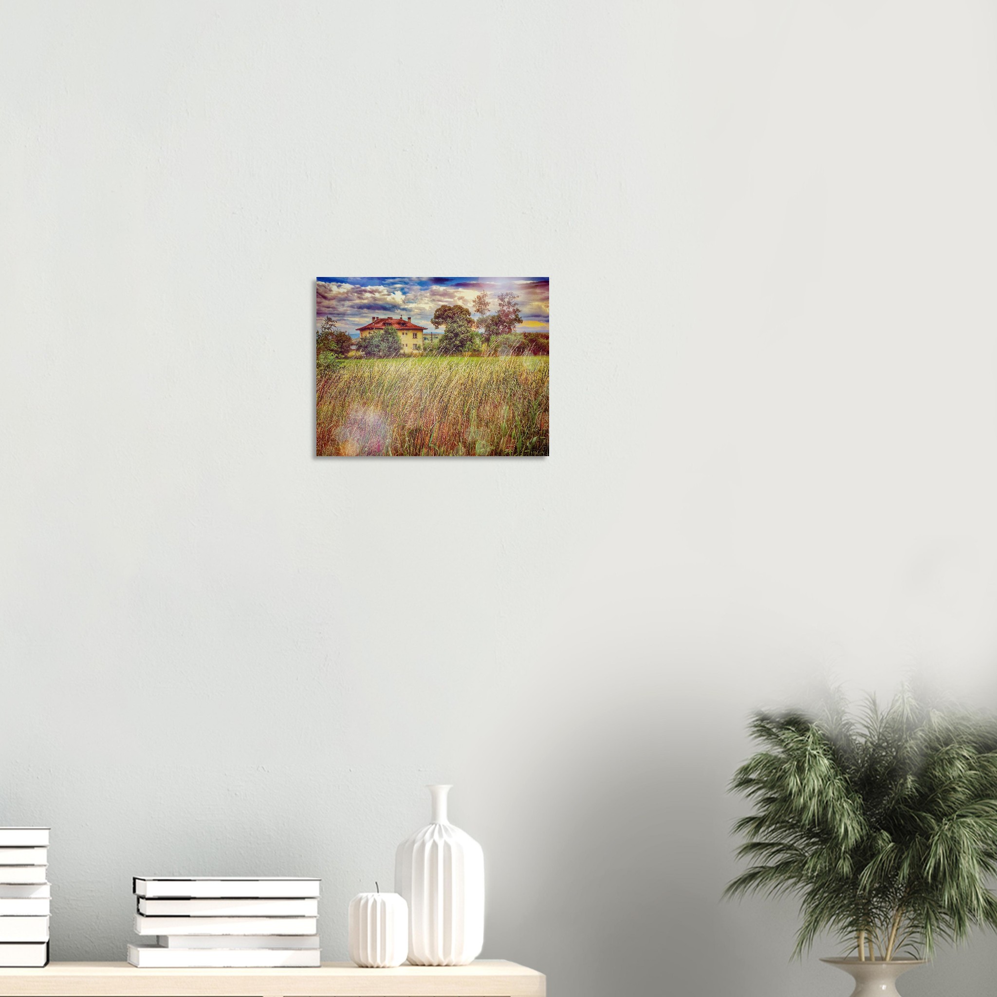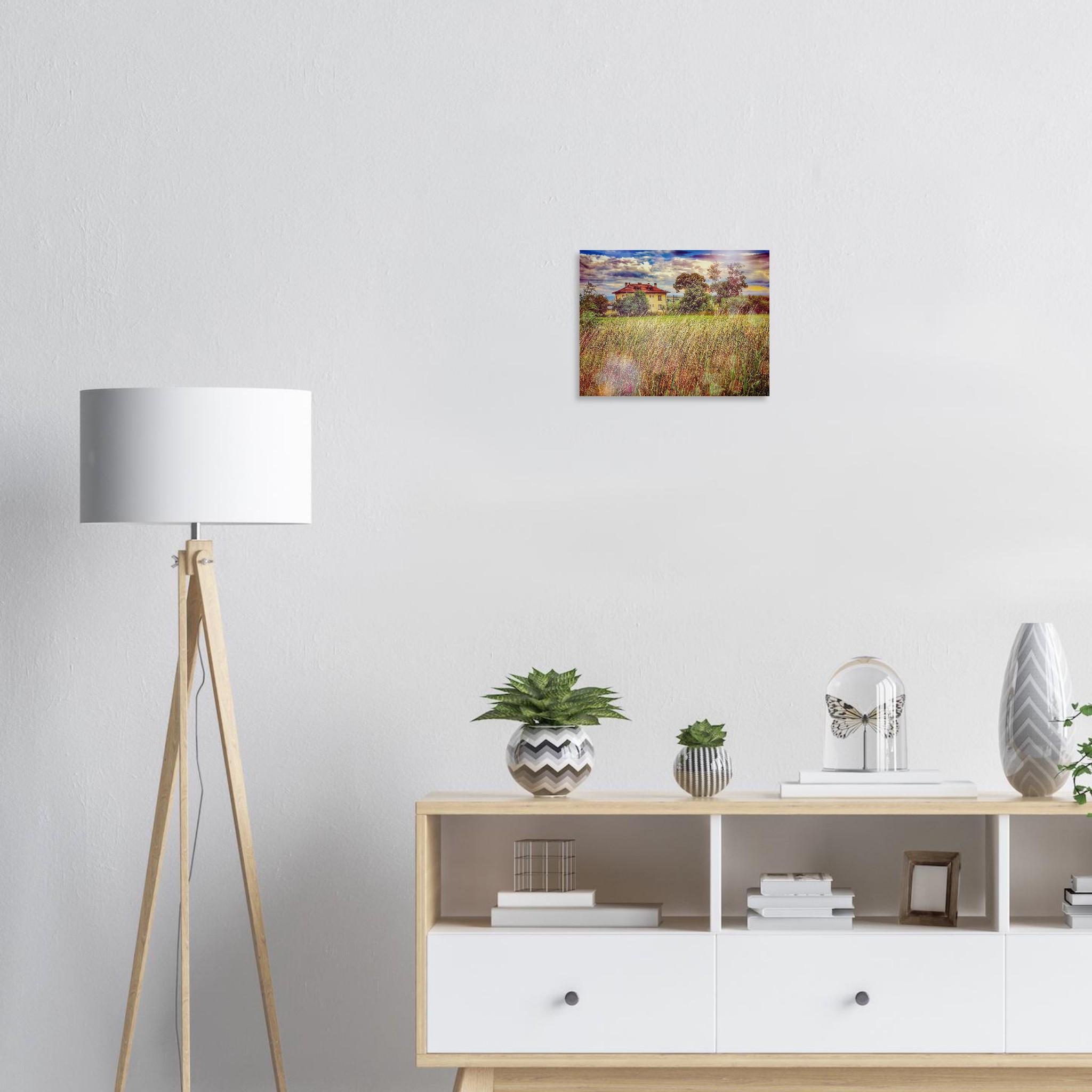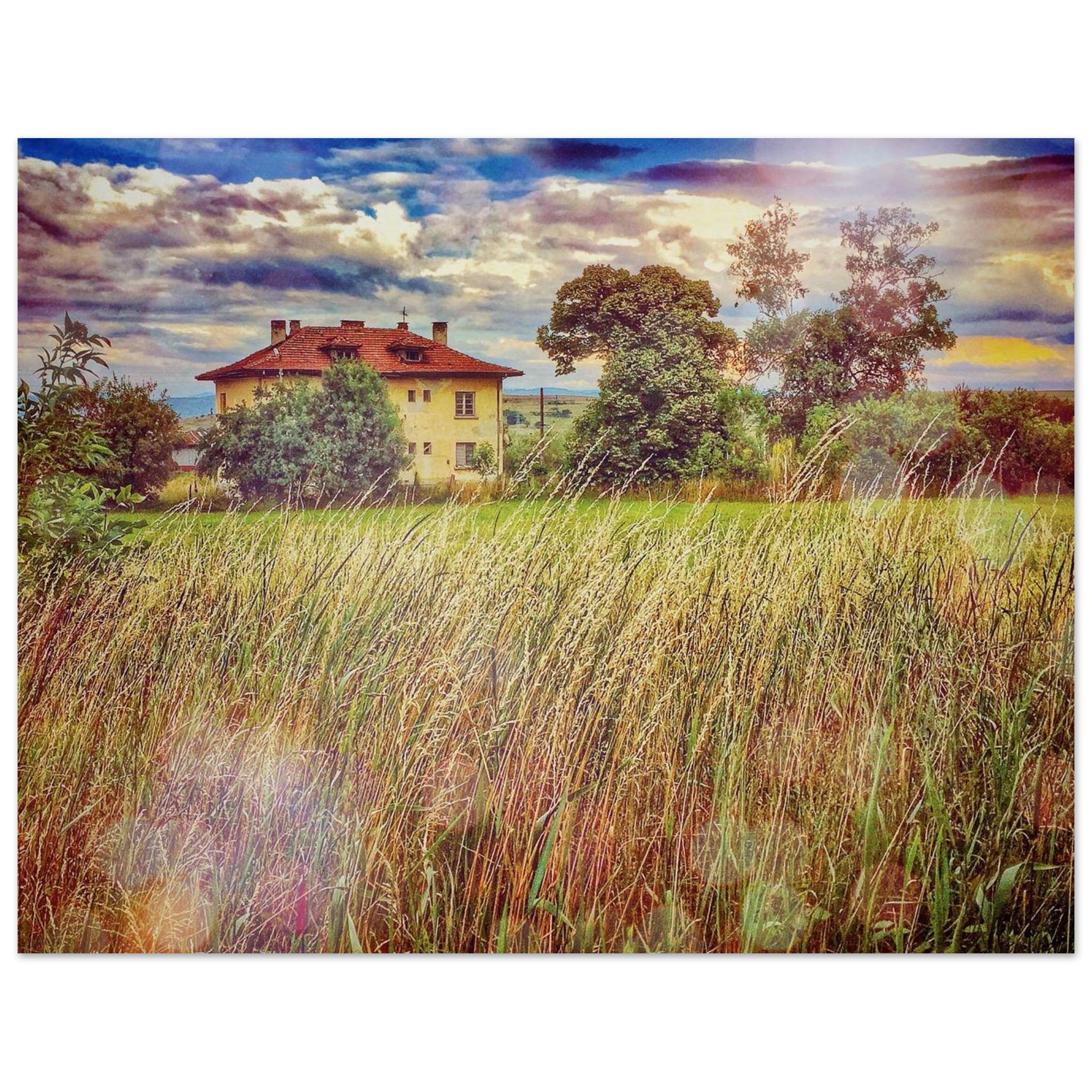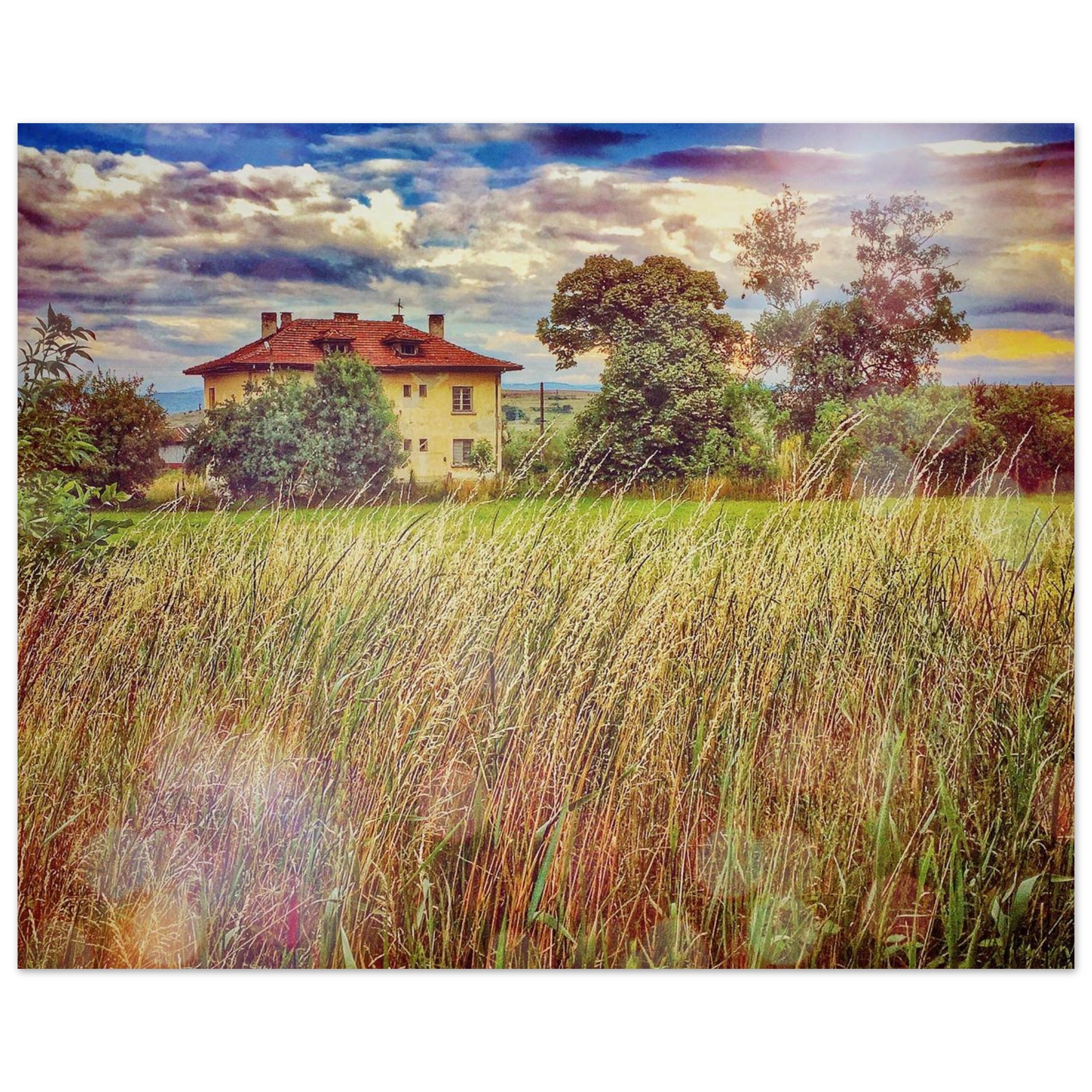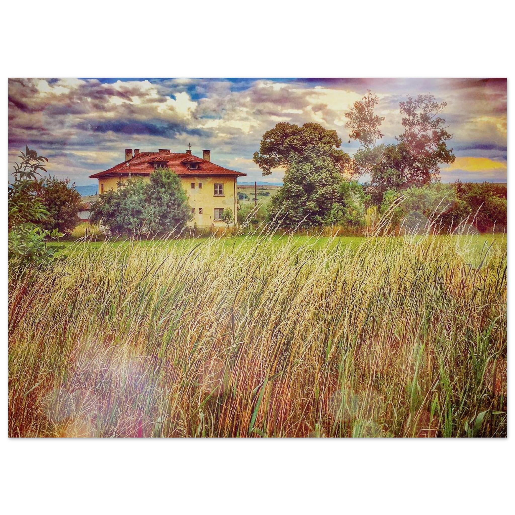 Immerse yourself in the serene beauty of the Bulgarian countryside with this captivating poster. Featuring a rustic house nestled amidst a golden field under a dramatic, colorful sky, this piece evokes a sense of tranquil escape and timeless charm. It’s an ideal addition for anyone looking to bring a touch of European pastoral elegance and vibrant, artistic flair into their home.