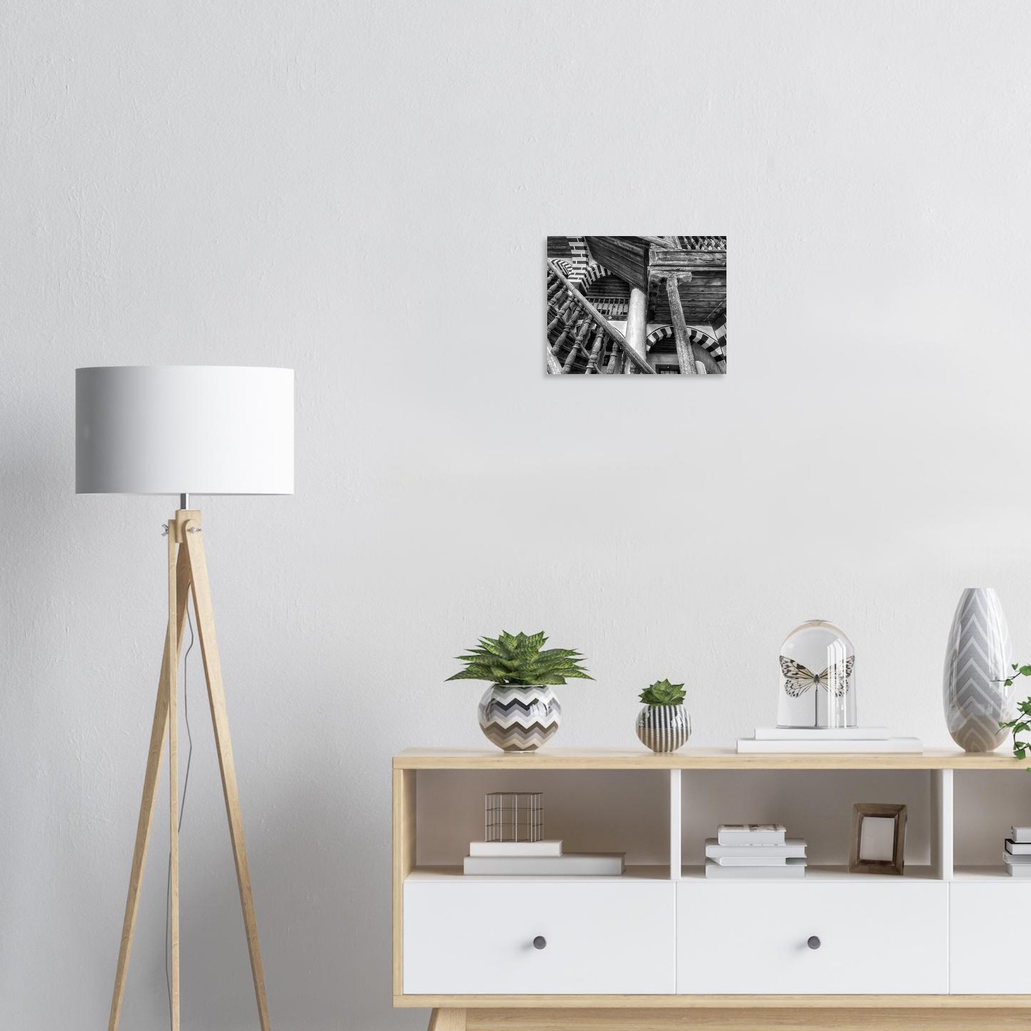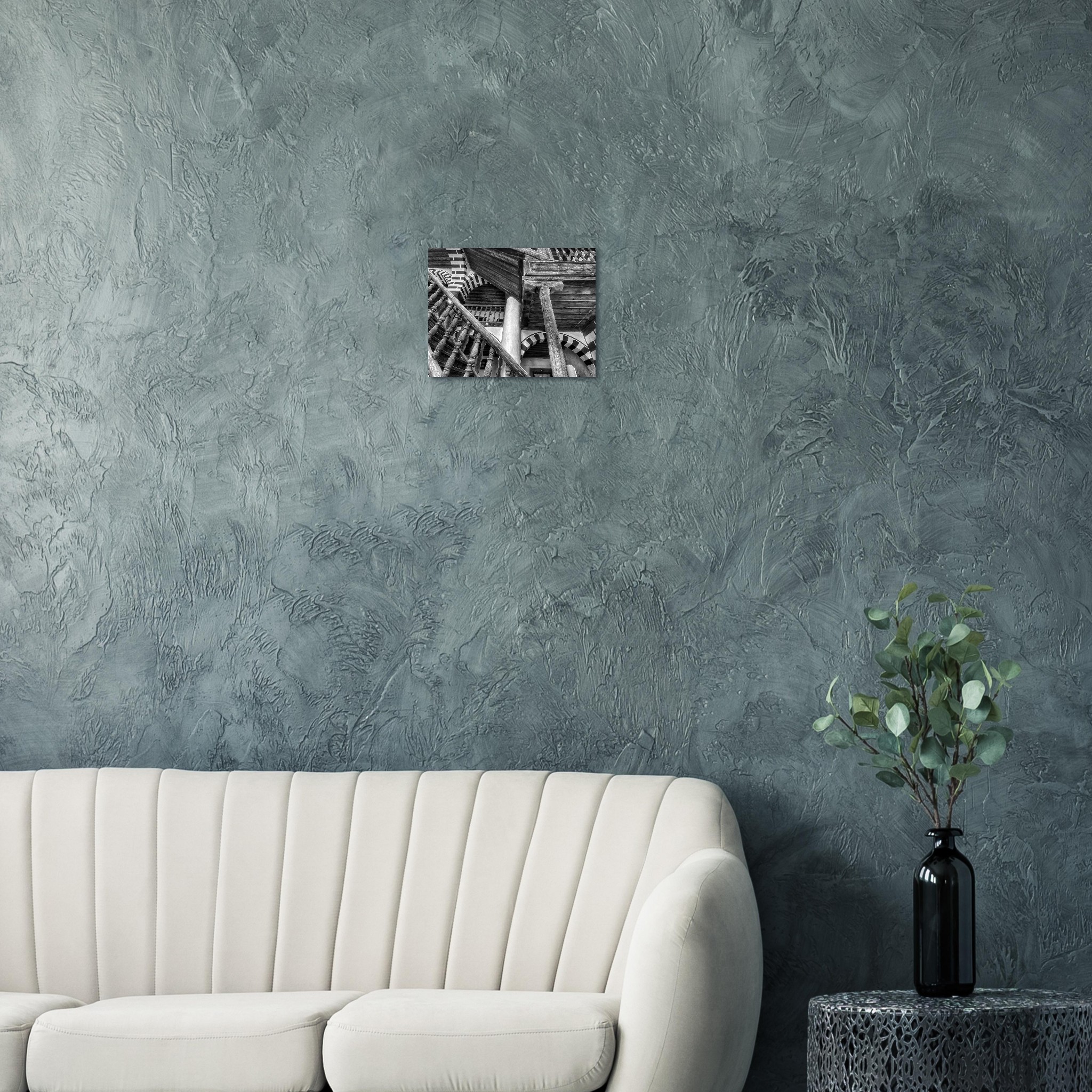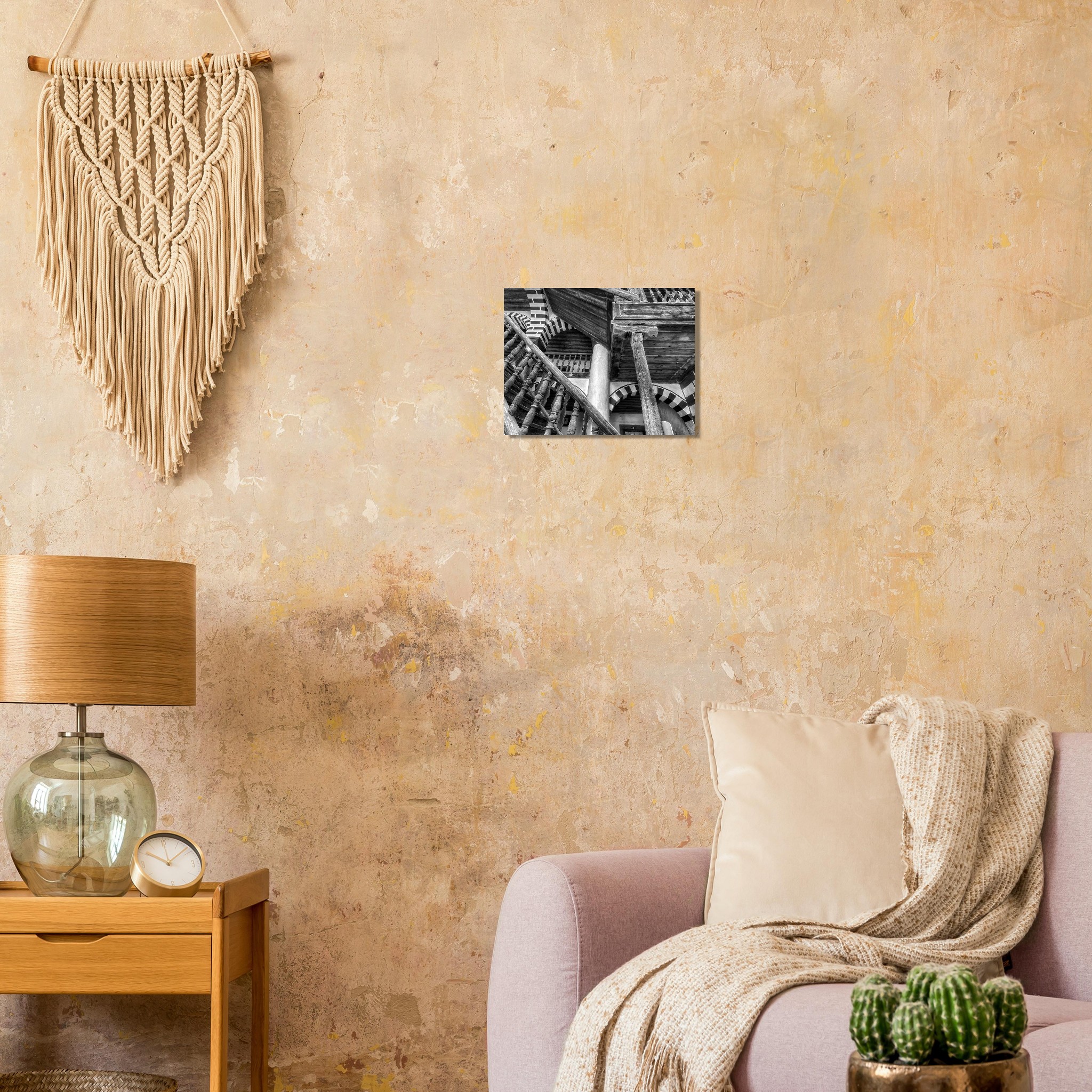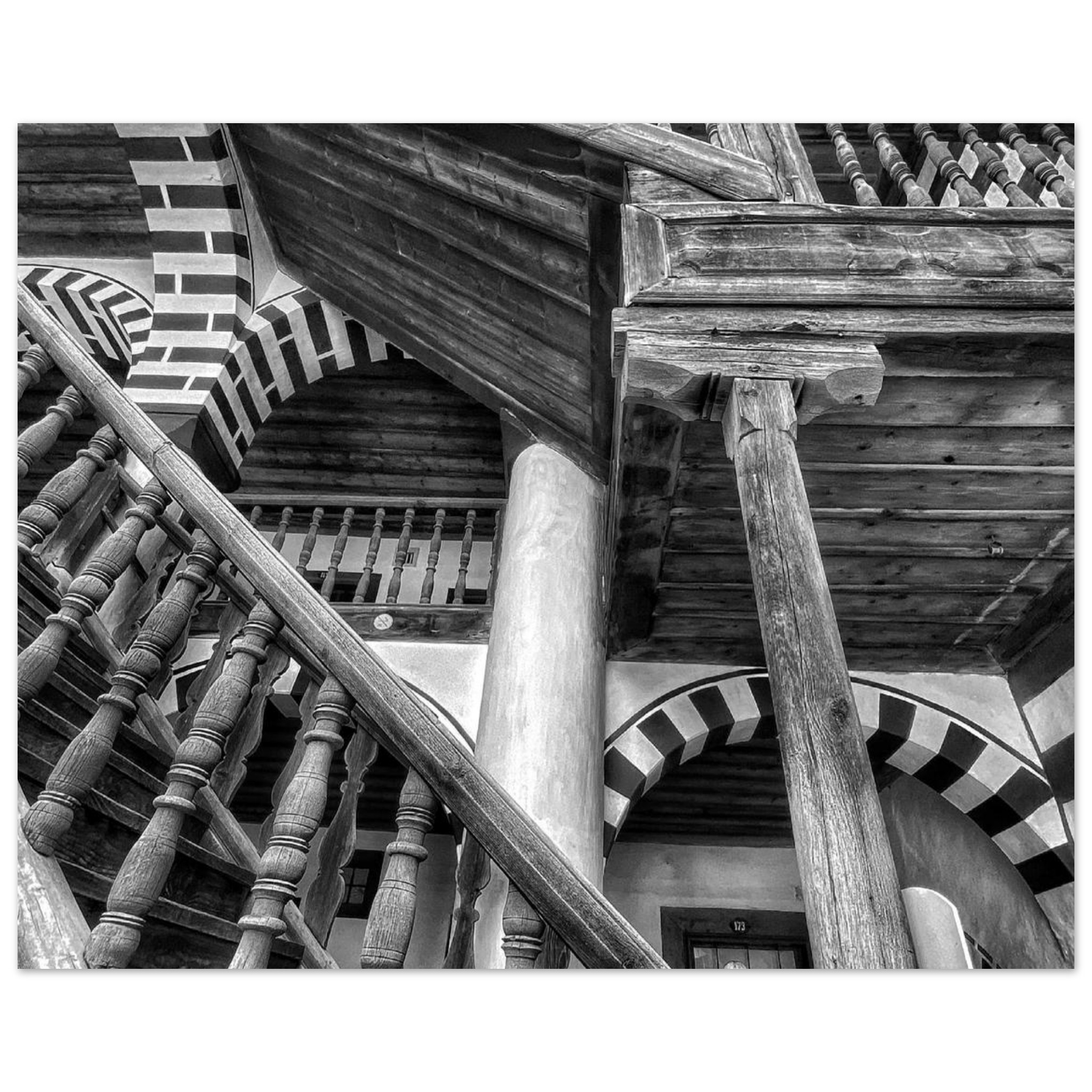Step into a world of timeless elegance with this captivating black and white print, featuring the intricate details of an ancient Bulgarian staircase at Rila Monastery. The rustic charm of weathered wood, the graceful curves of the balustrades, and the striking checkered patterns of the arches create a sense of history and architectural grandeur. This piece brings a sophisticated, vintage mood to any room, inviting contemplation and a touch of European heritage.