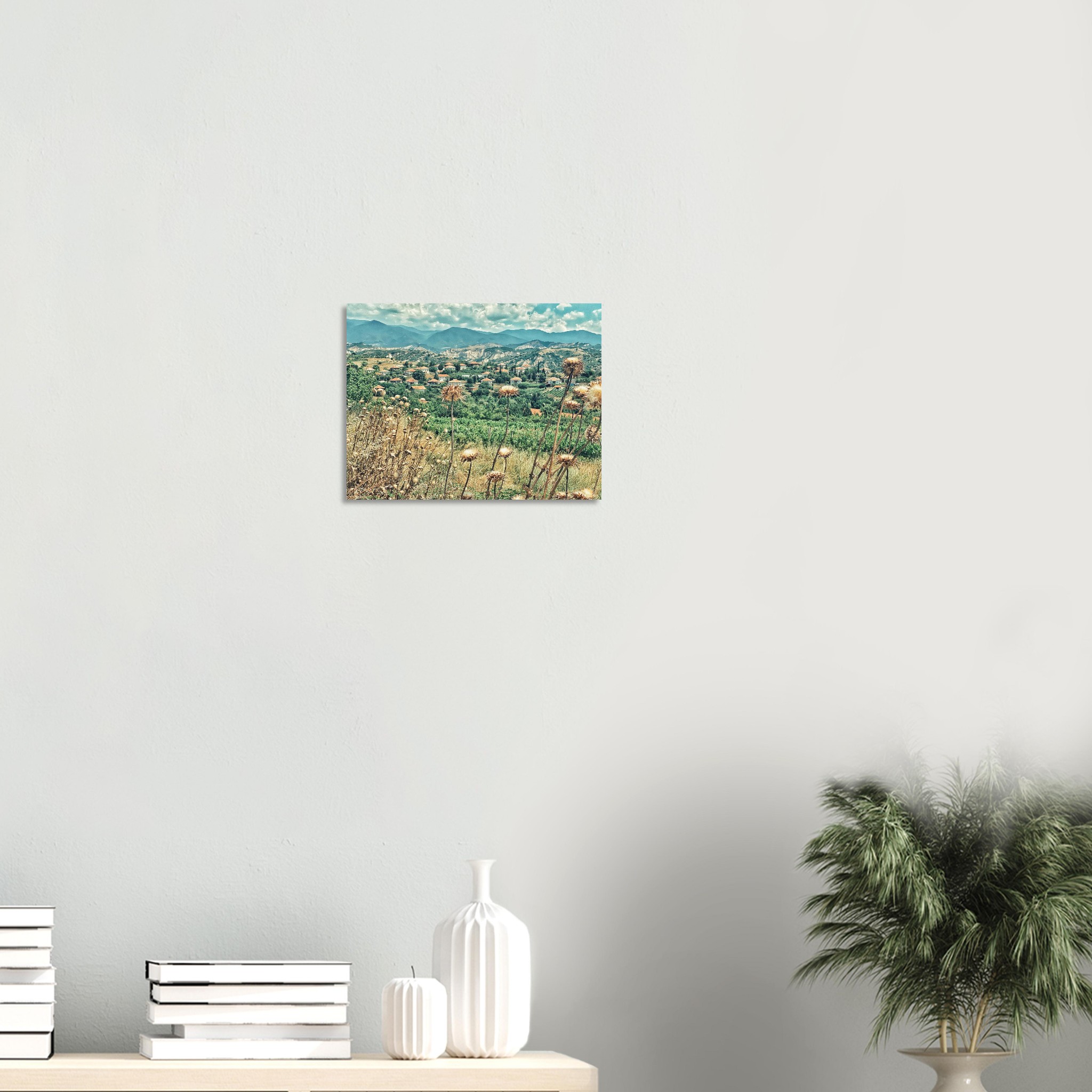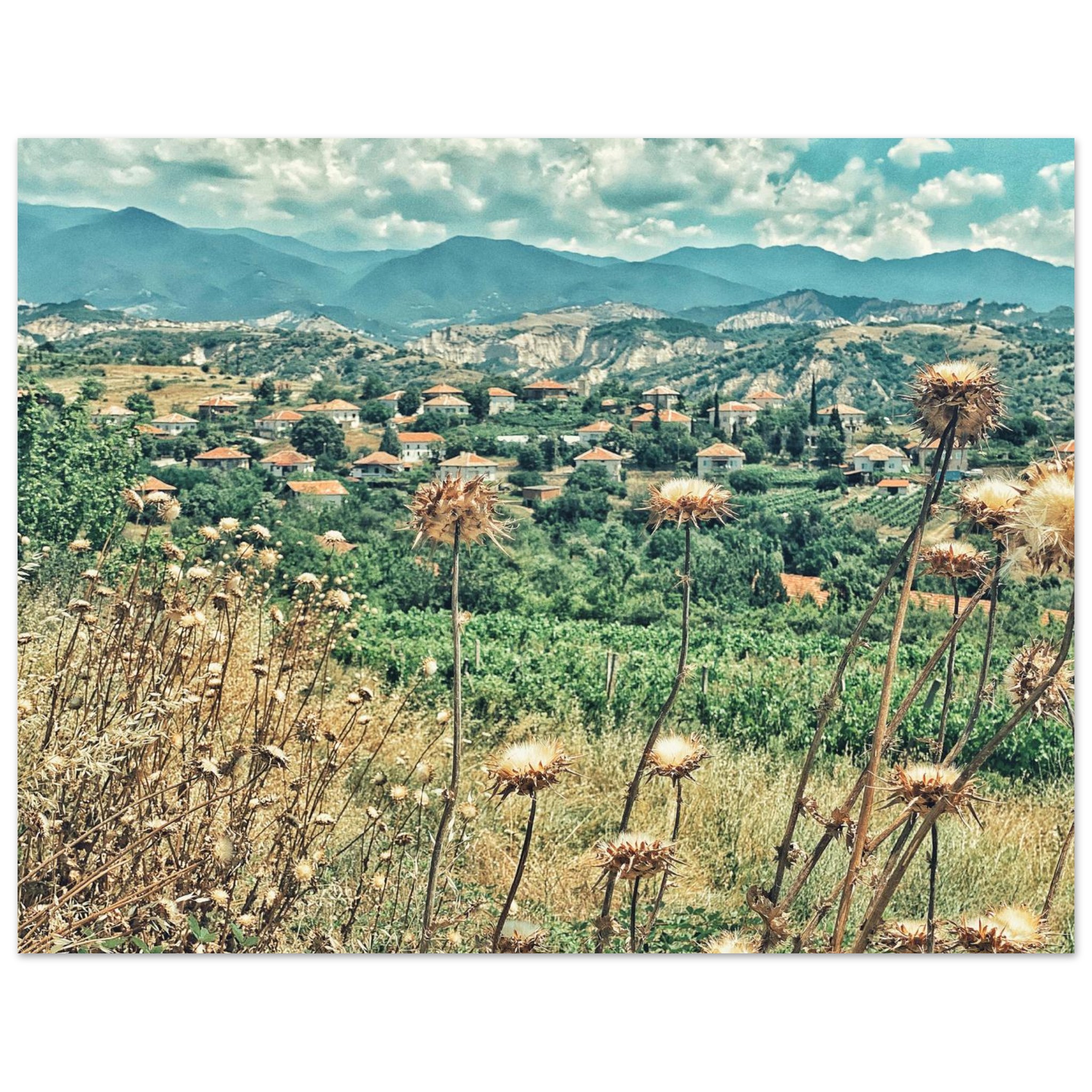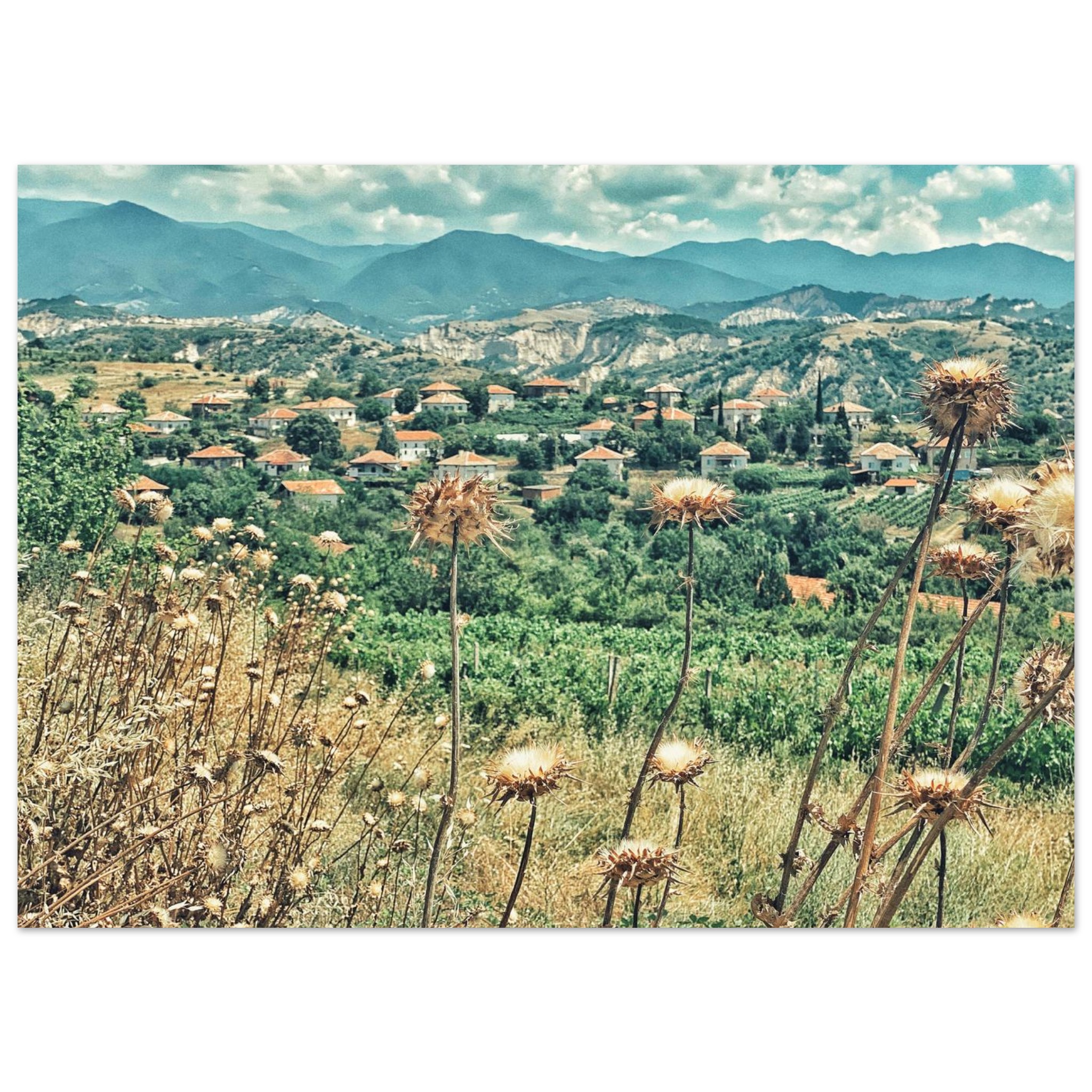 Immerse yourself in the serene beauty of a classic Bulgarian landscape, capturing the view from above the village of Botunya. This evocative image, with its sun-drenched thistles and distant red-roofed village against a backdrop of rolling hills, brings a touch of rustic tranquility and timeless European character to any space. It’s perfect for art lovers and wanderlust dreamers seeking a unique piece that tells a story.