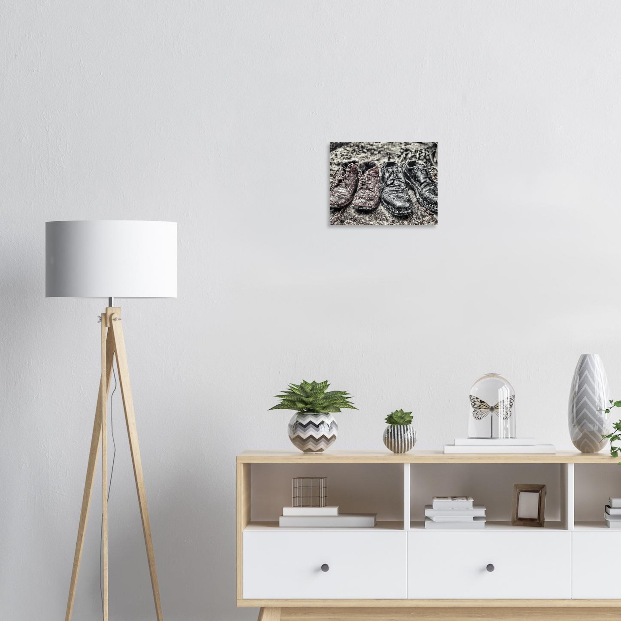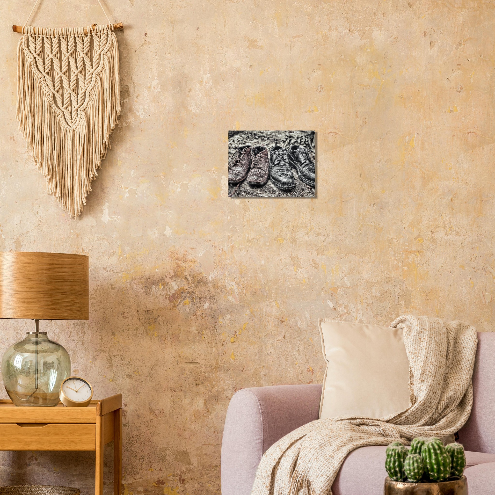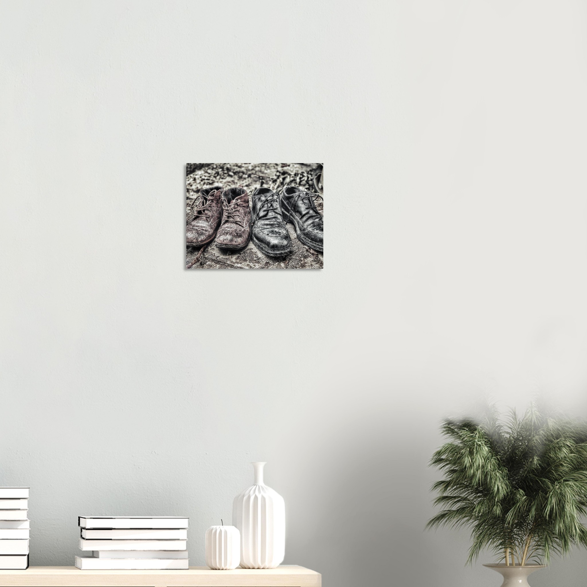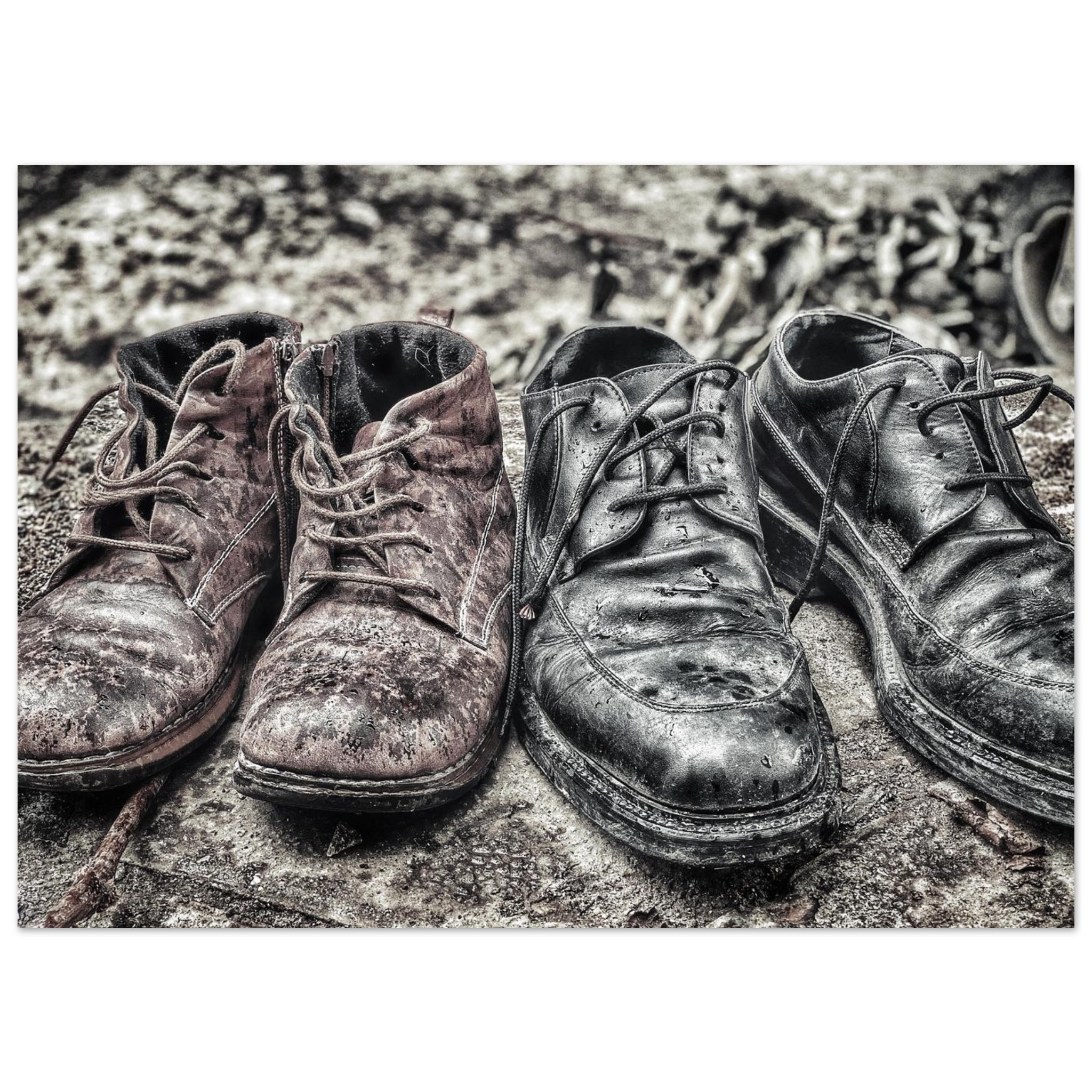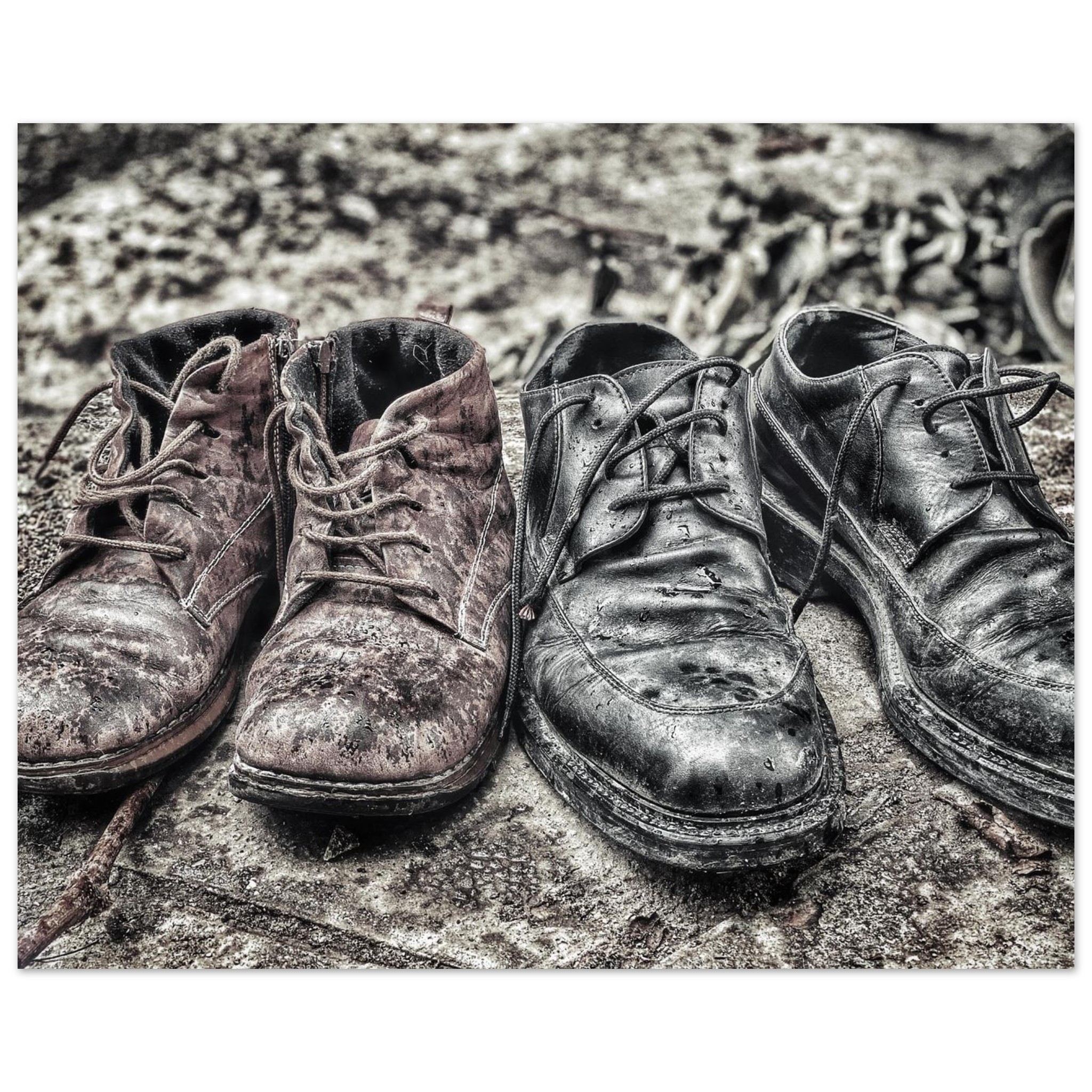 Forgotten shoes that have seen a lot of life. The image evokes a sense of journey and history, perfect for adding a touch of rustic charm and wanderlust to any space. Its desaturated, gritty texture offers a unique aesthetic that speaks to adventurers and history buffs alike, making it a compelling focal point in your home or office.
