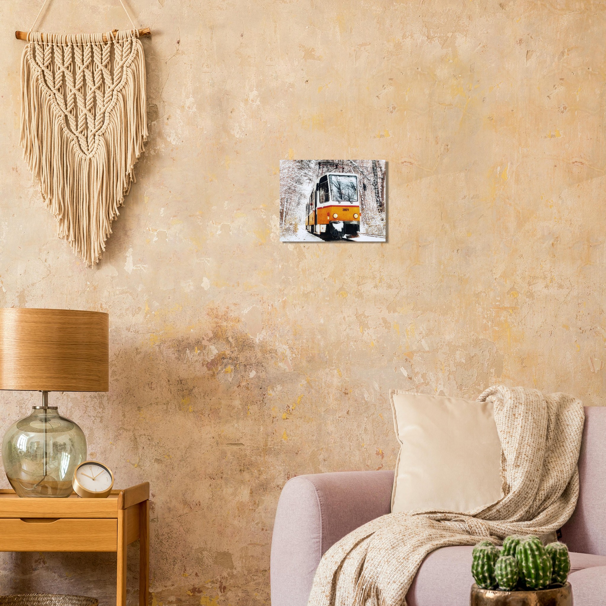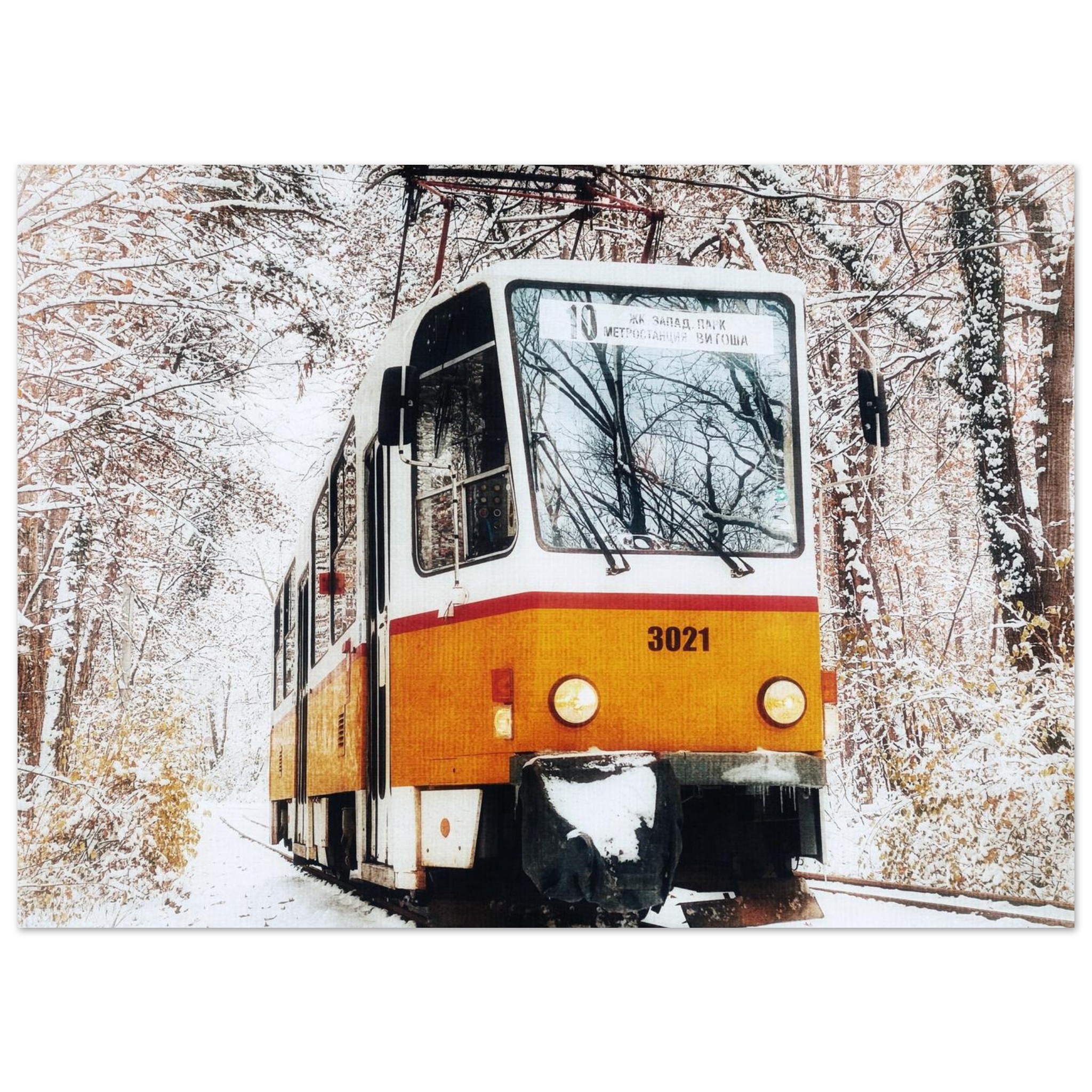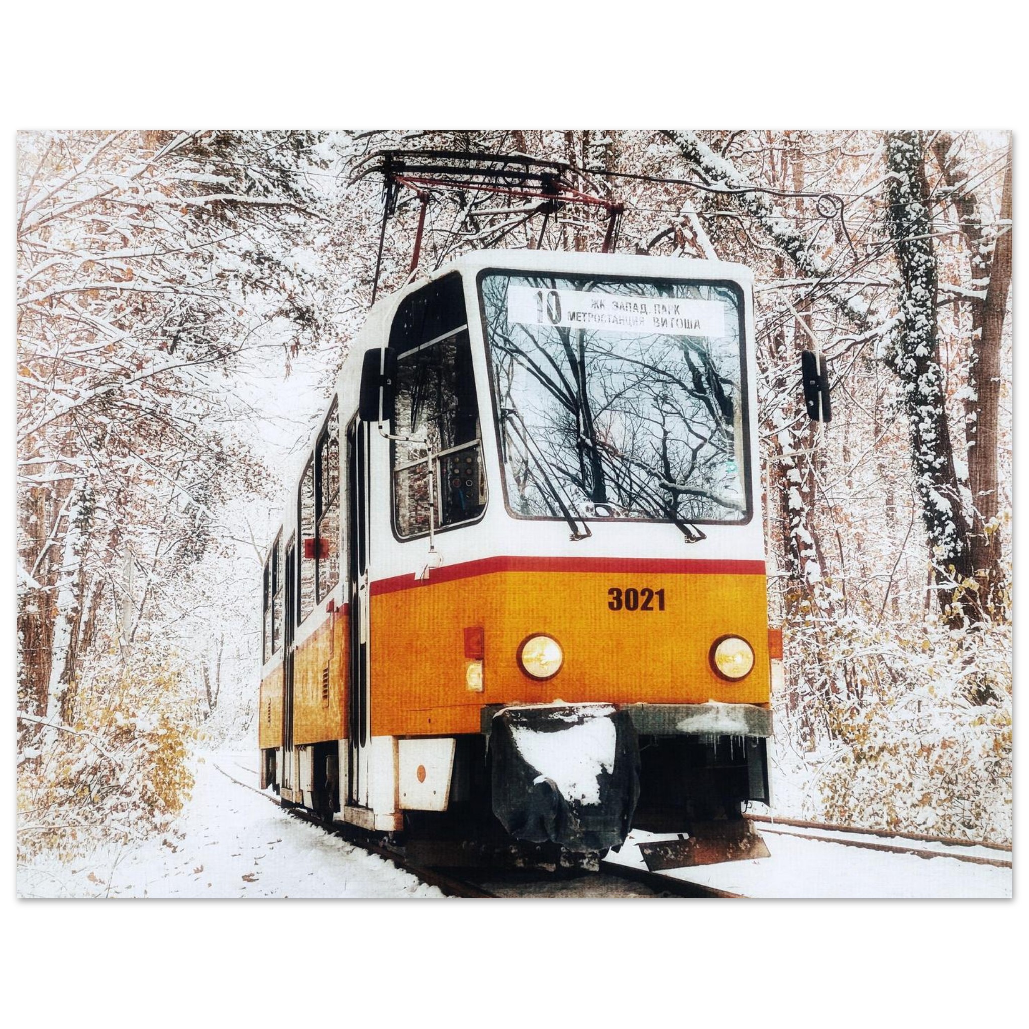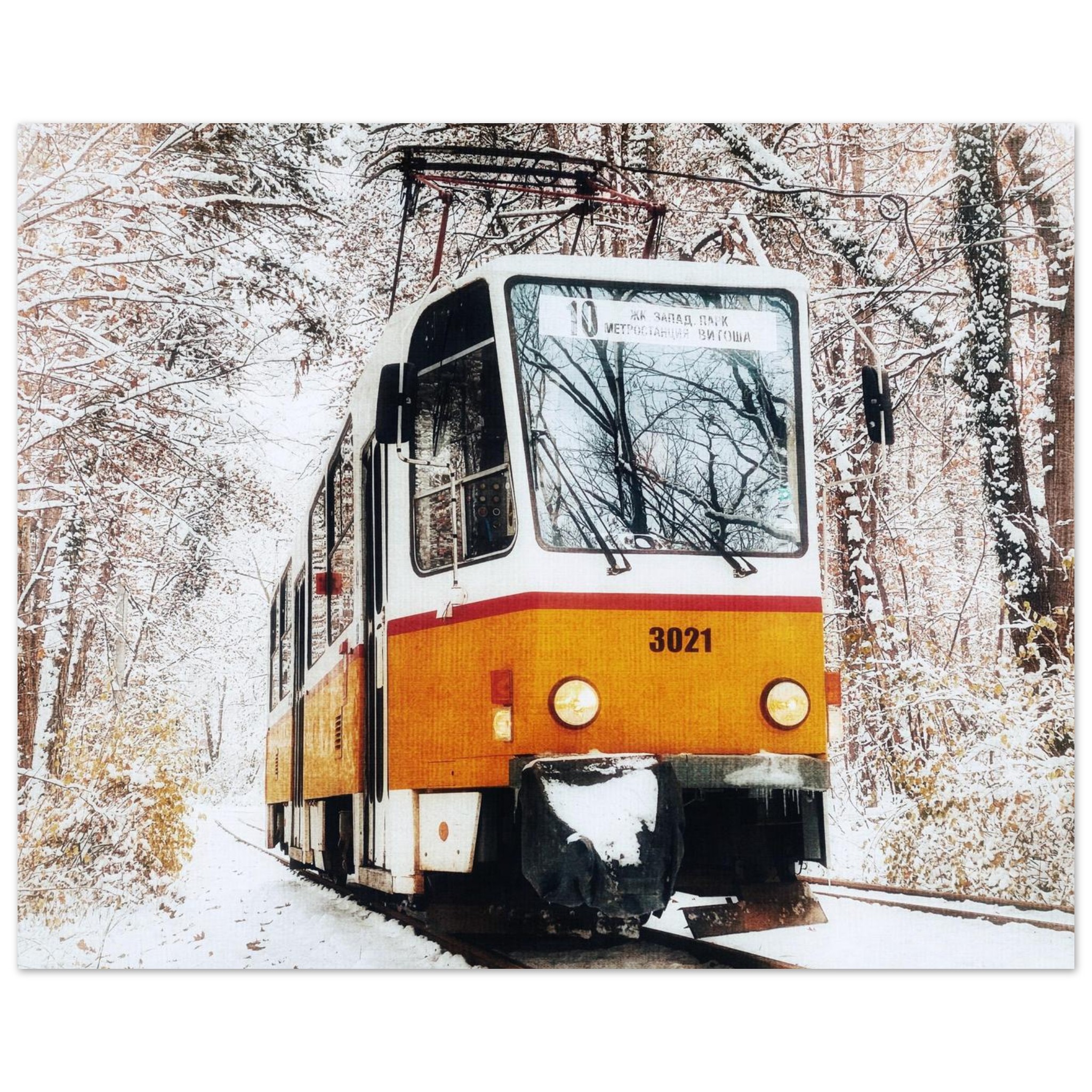 Capture the nostalgic charm of a classic Bulgarian tram, making its way through a serene, snow-dusted landscape in the capital of Sofia. This evocative scene, with its soft, muted winter colors and the warm glow of the tram, brings a touch of vintage allure and tranquil beauty to any space. It’s perfect for those who appreciate historical transportation, European travel, or simply the quiet magic of a snowy day.