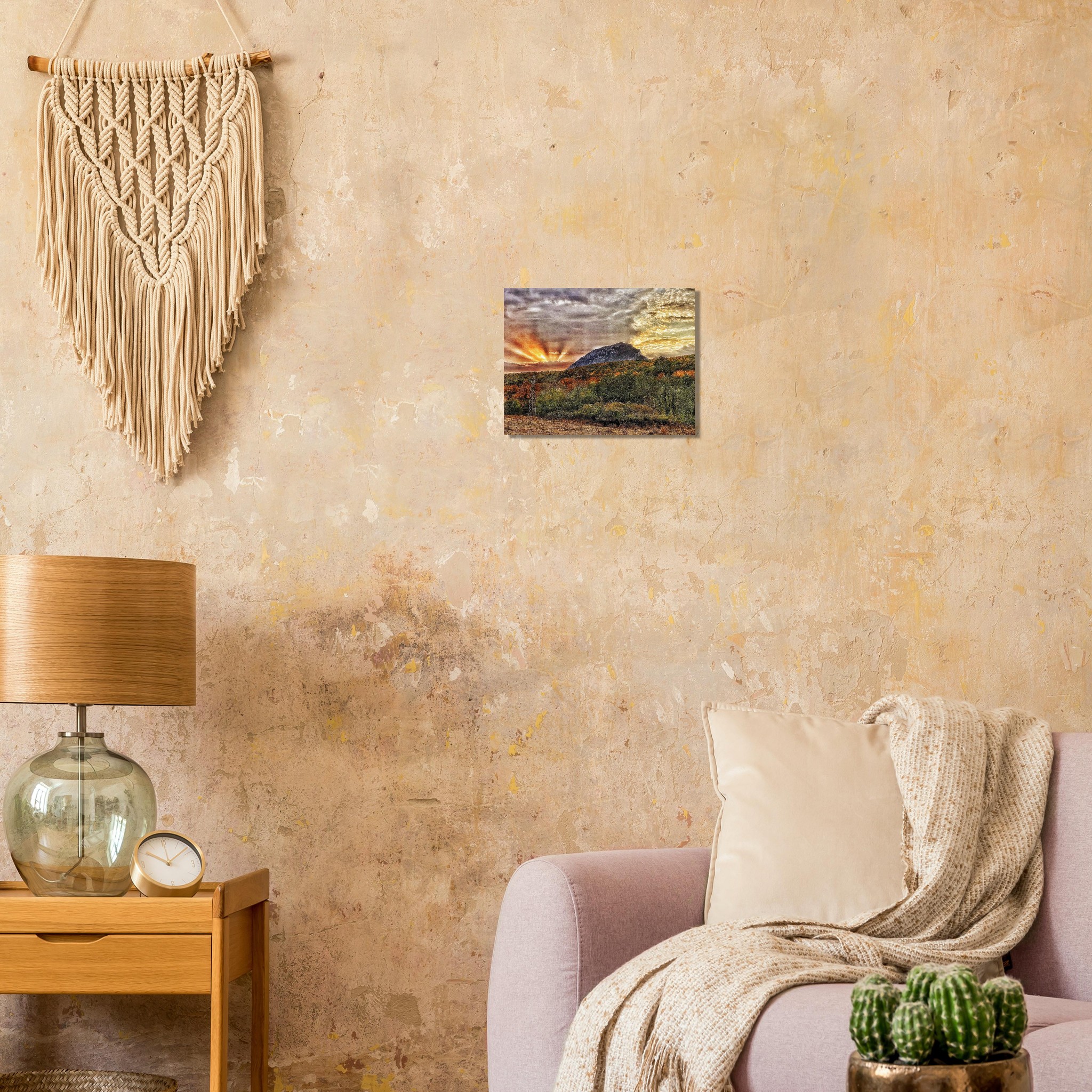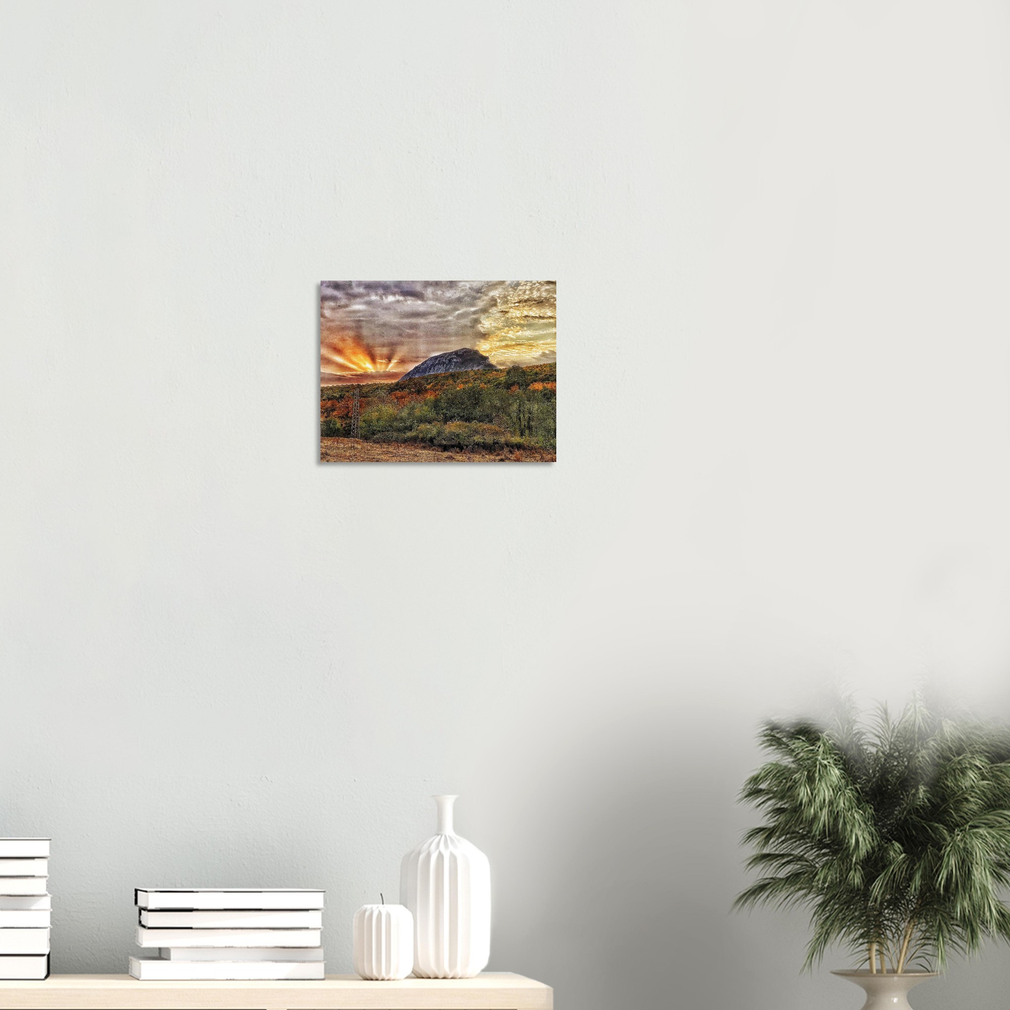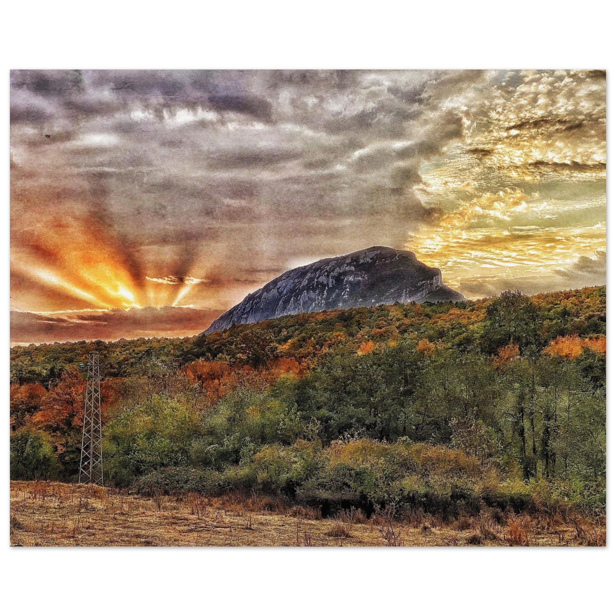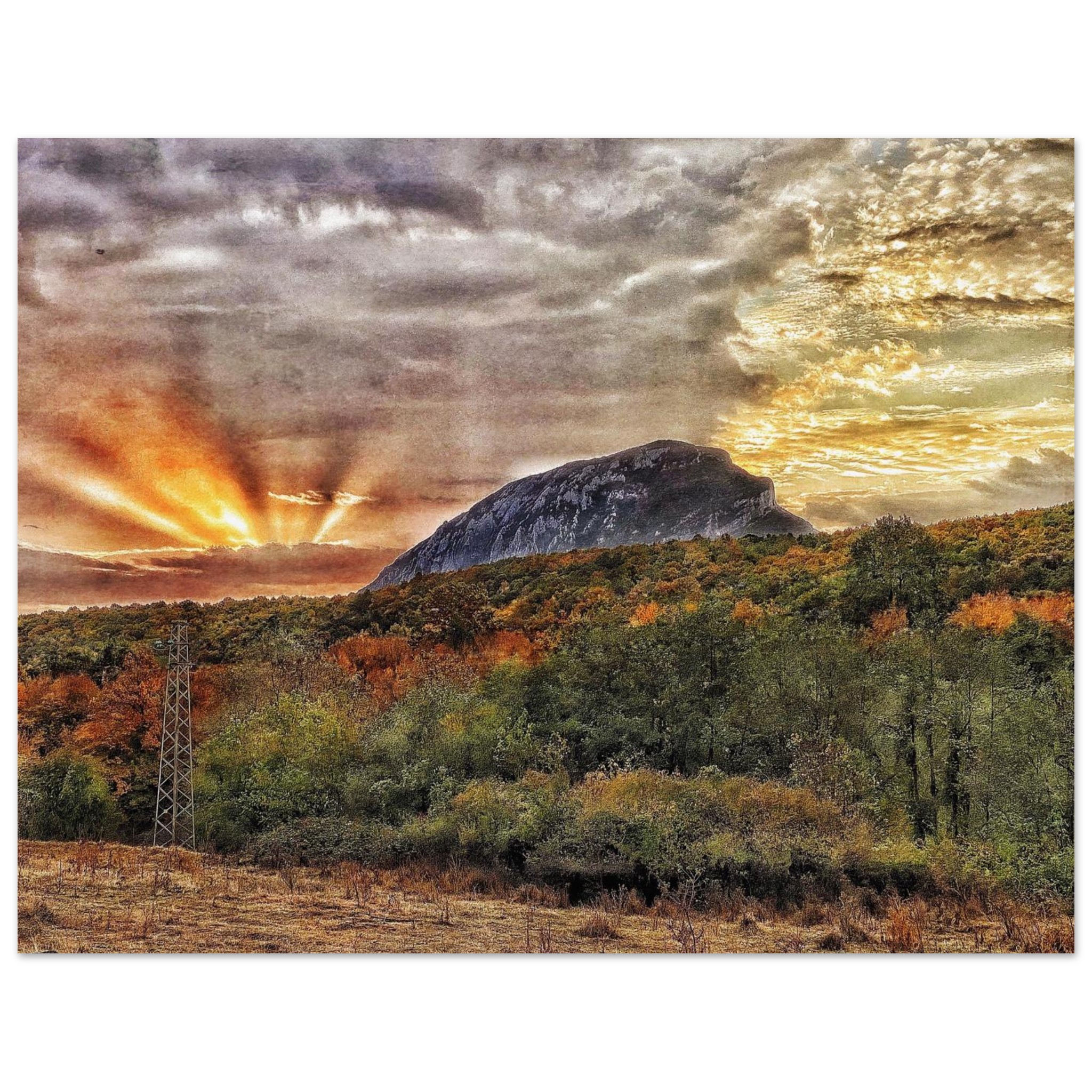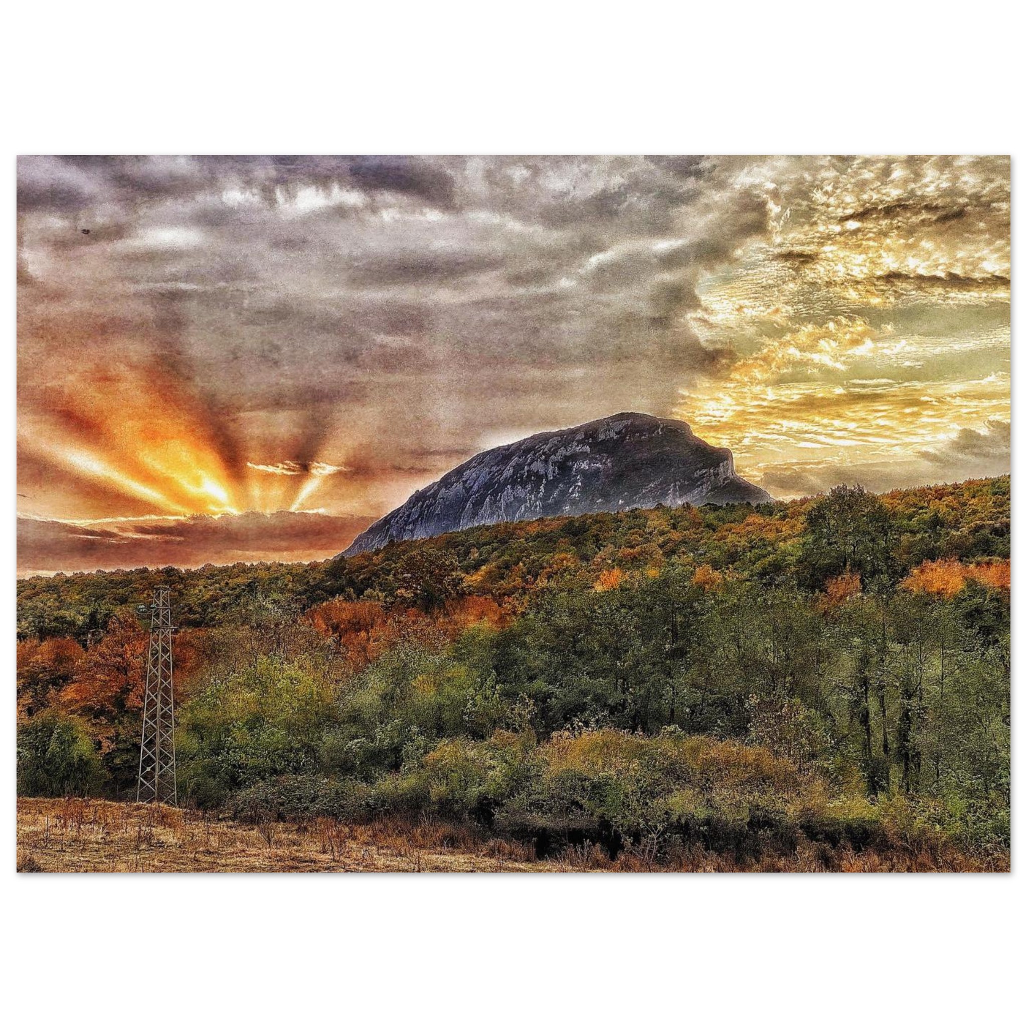 Capture the breathtaking beauty of a Balkan mountain sunset with this stunning print. The dramatic play of light and shadow, with sunbeams piercing through the clouds, creates an atmosphere of serene grandeur. This art piece, featuring rich, warm hues of orange and yellow against a majestic mountain silhouette and an autumnal landscape, will infuse any space with a sense of wonder and natural elegance.