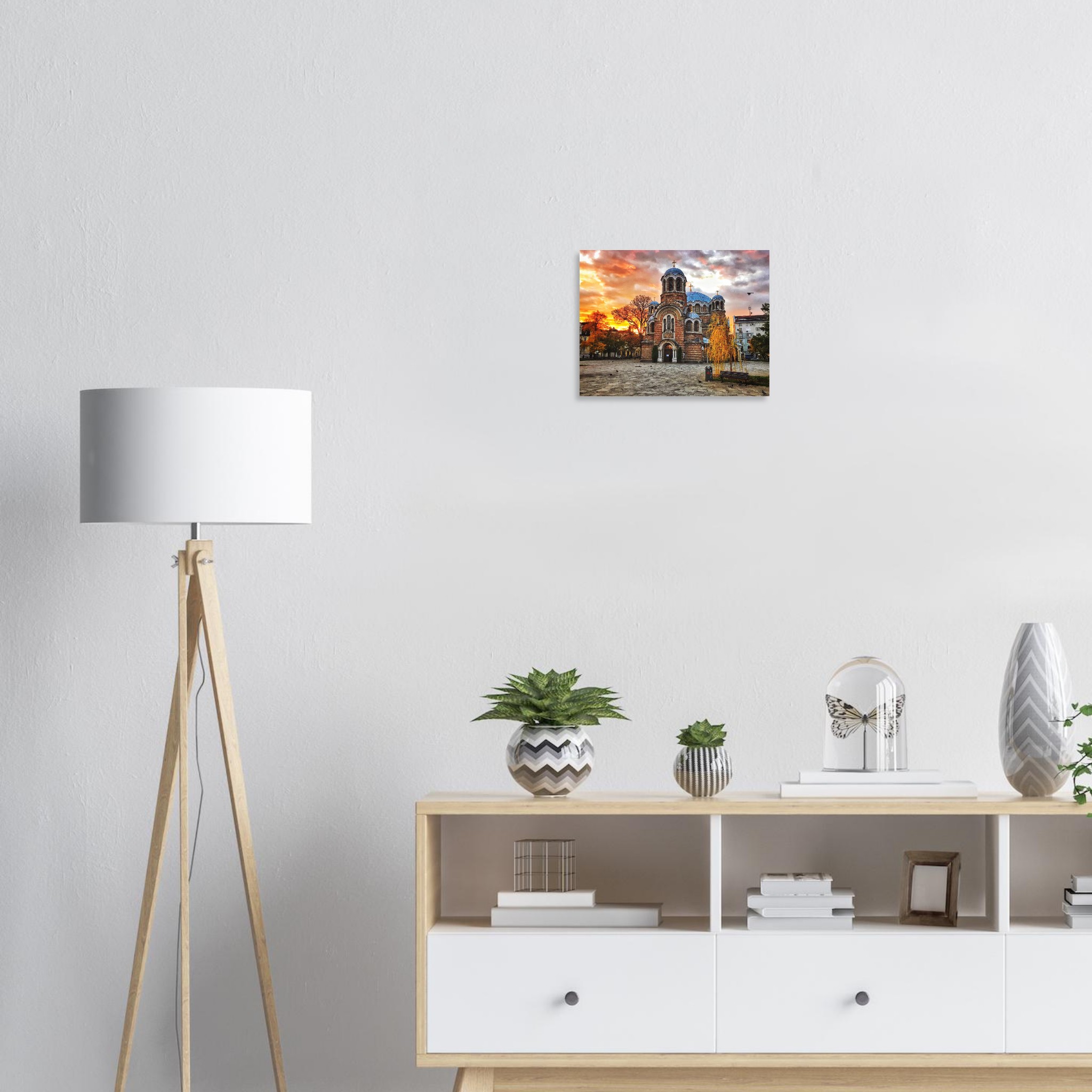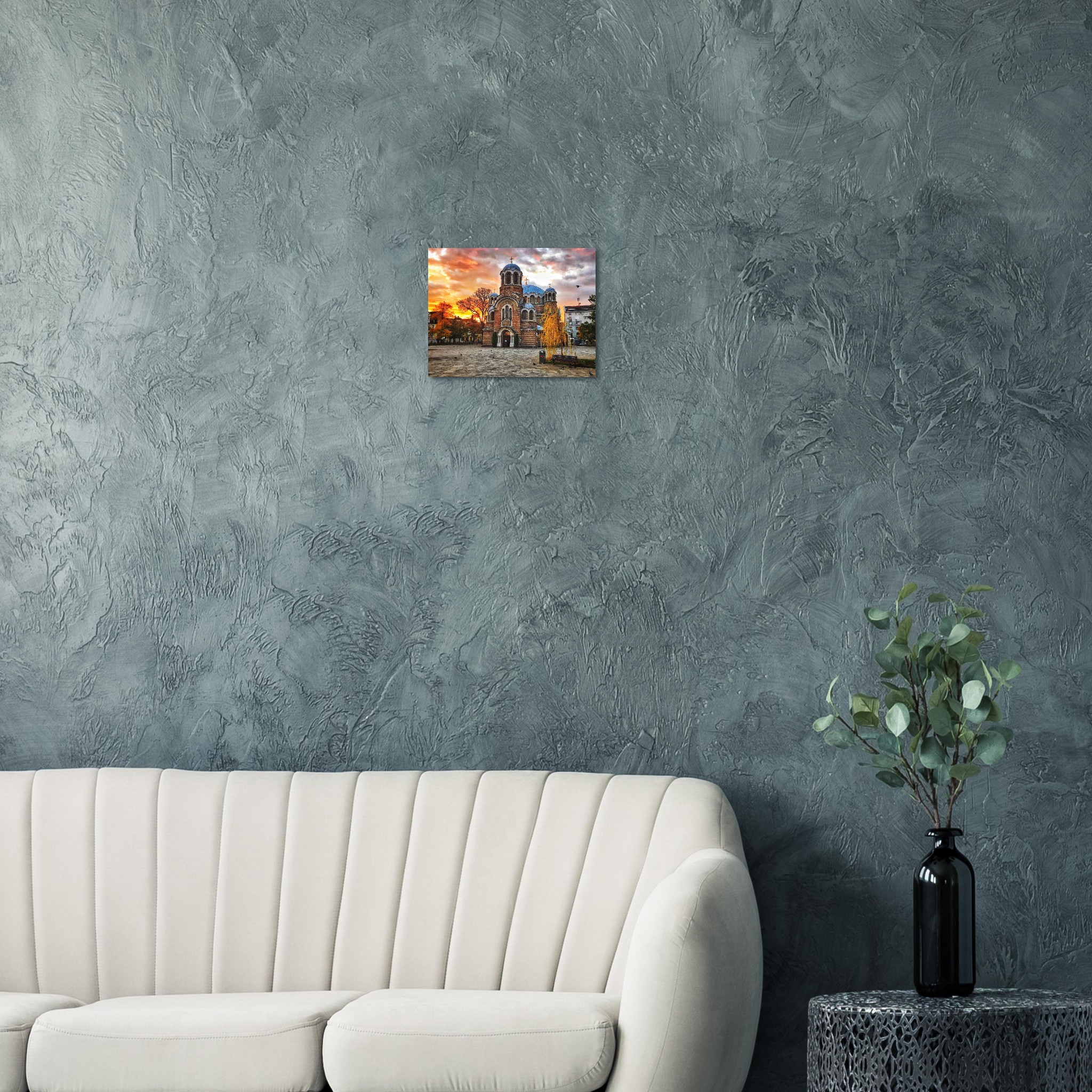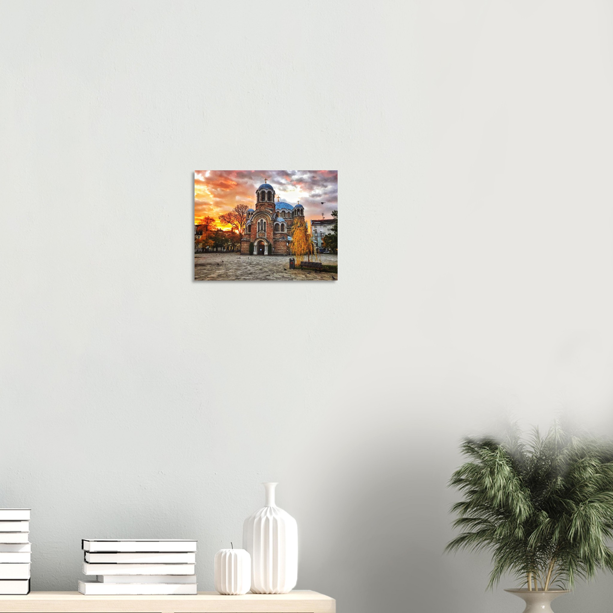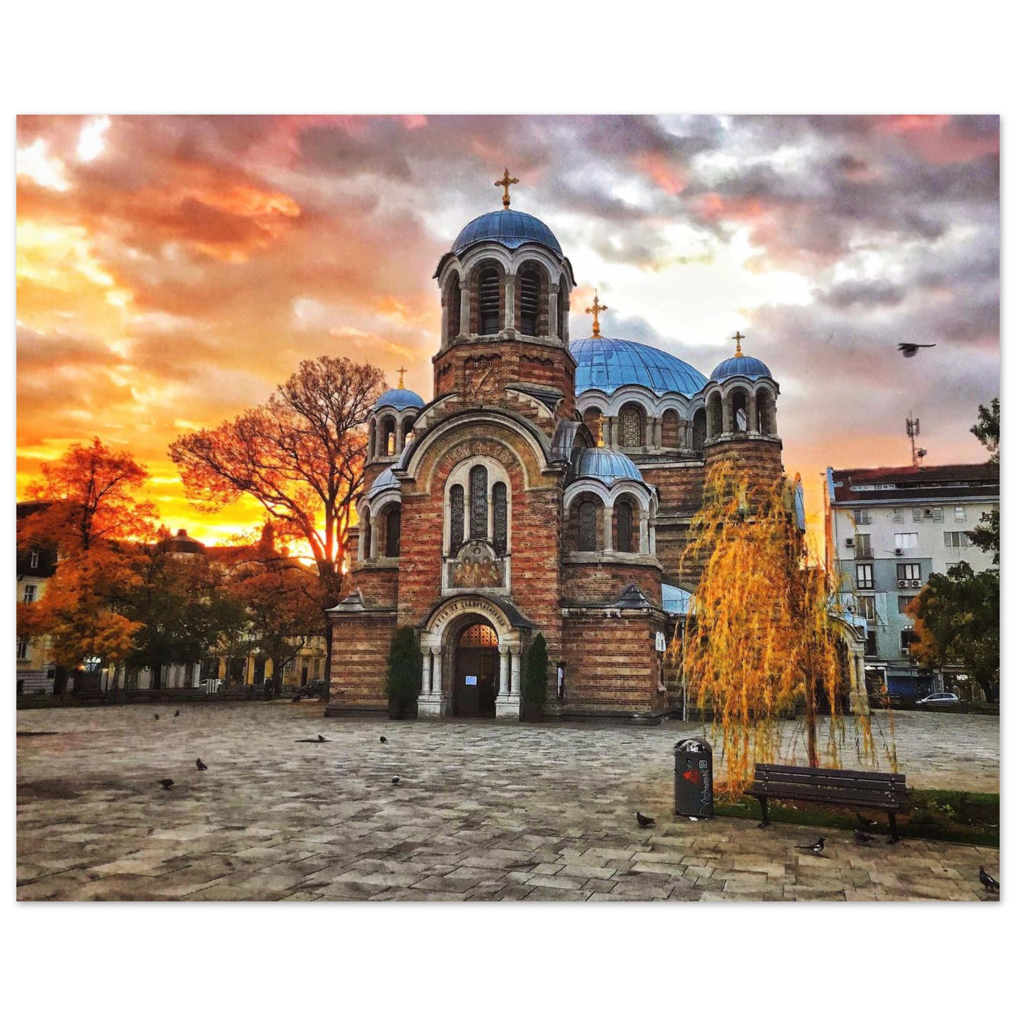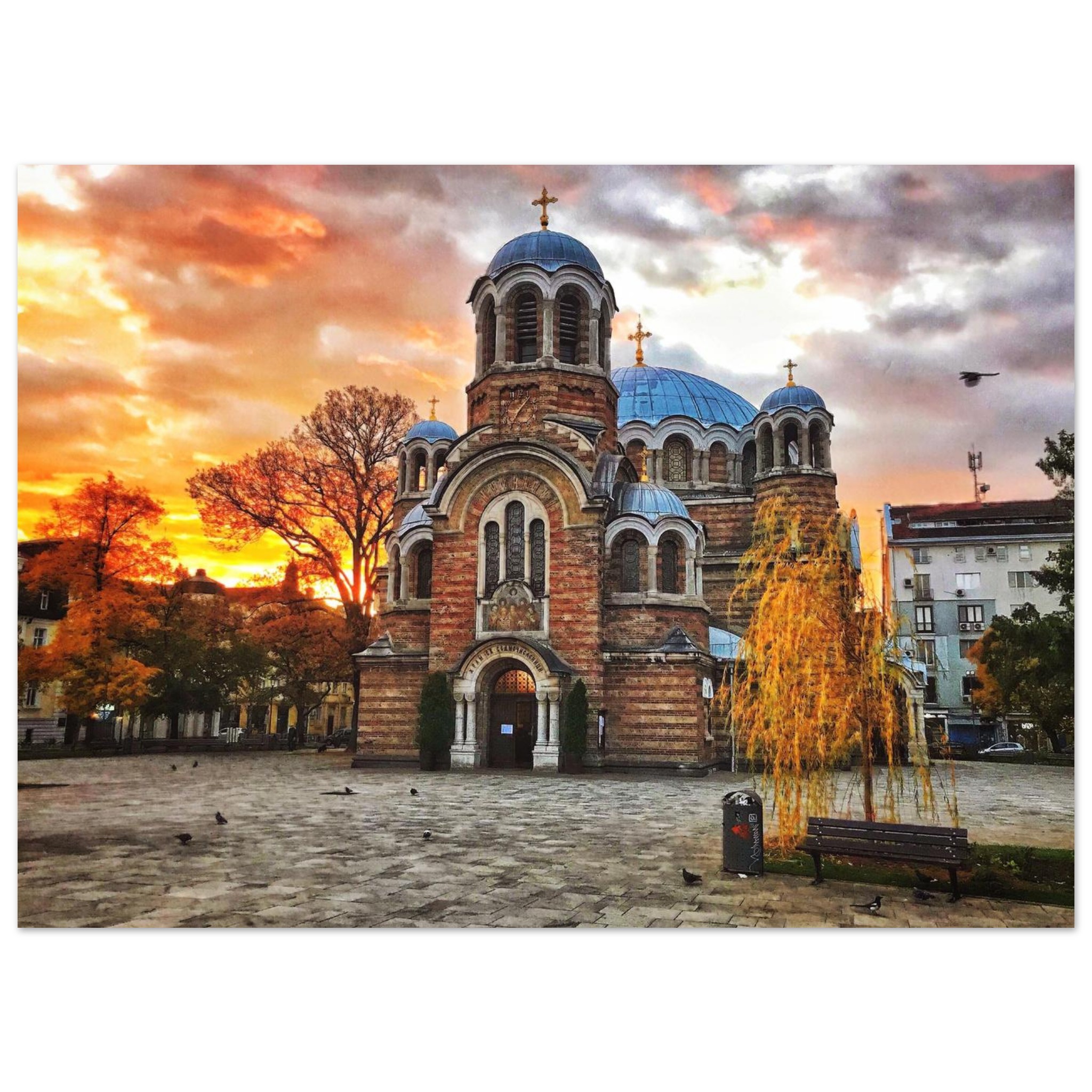 Capture the breathtaking beauty of Sofia with this stunning depiction of a Bulgarian cathedral bathed in the warm glow of an autumn sunset. The rich, fiery oranges and deep purples of the sky create a dramatic backdrop for the intricate architecture, bringing a sense of historic grandeur and serene wonder into your space. This poster is a perfect piece to evoke wanderlust and appreciation for European charm.