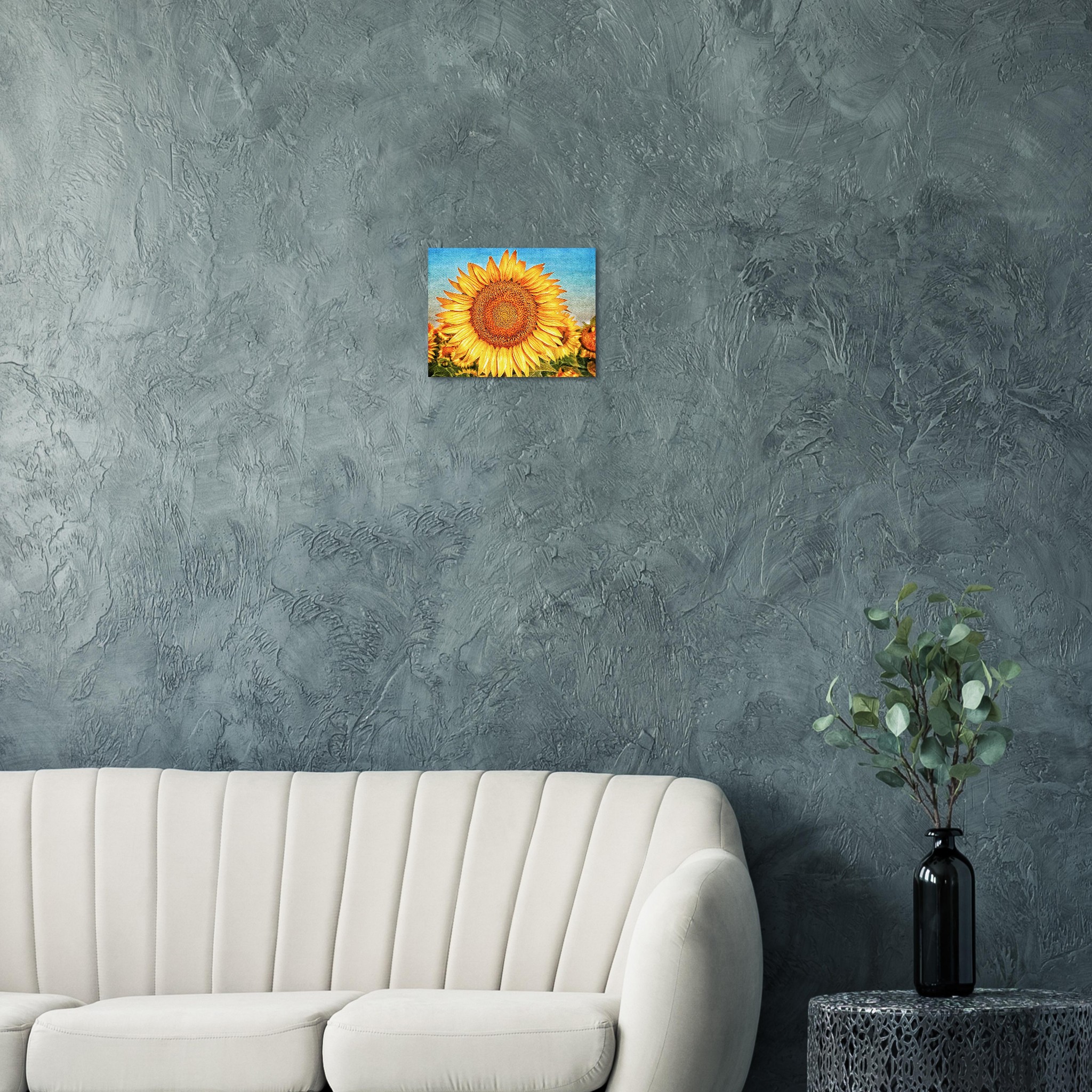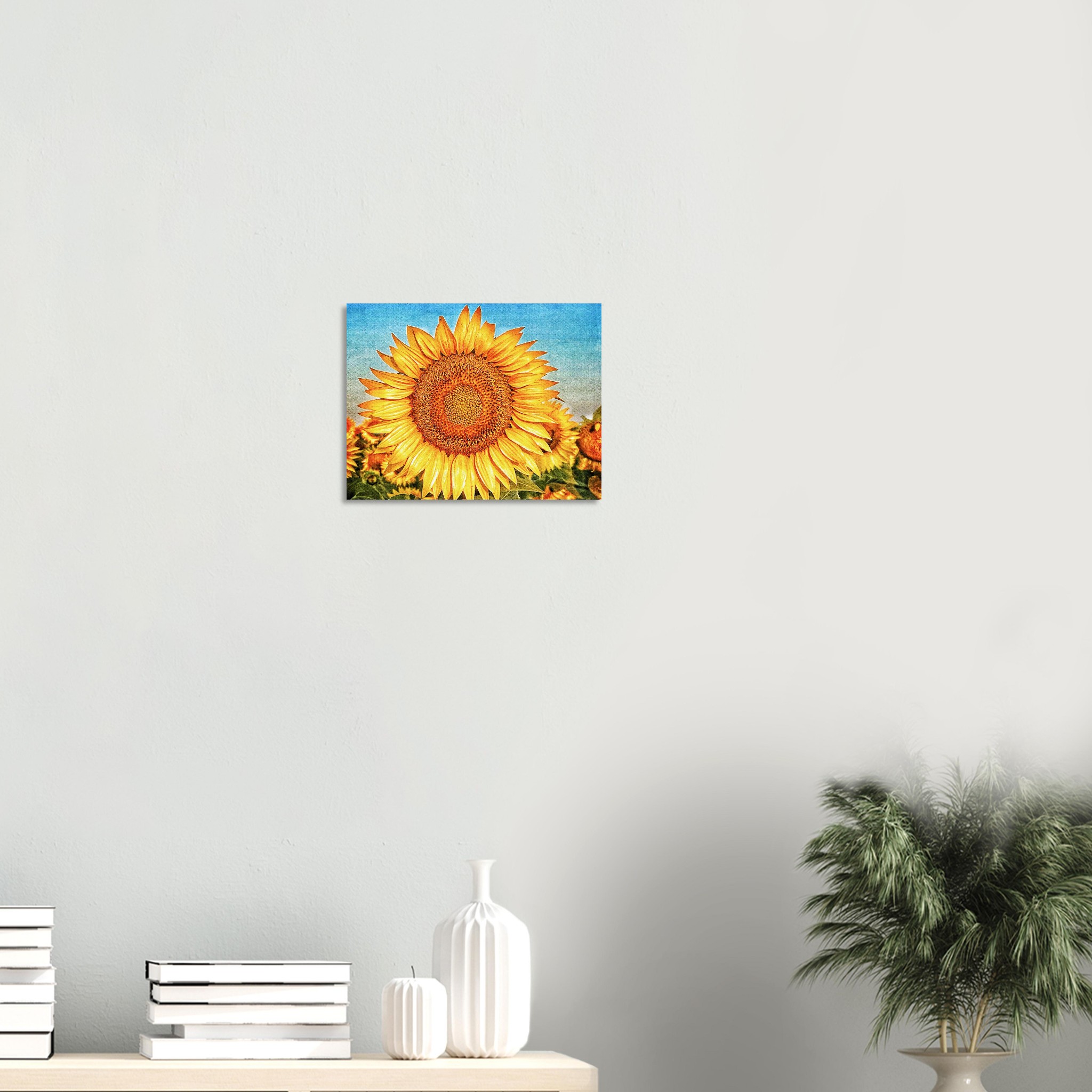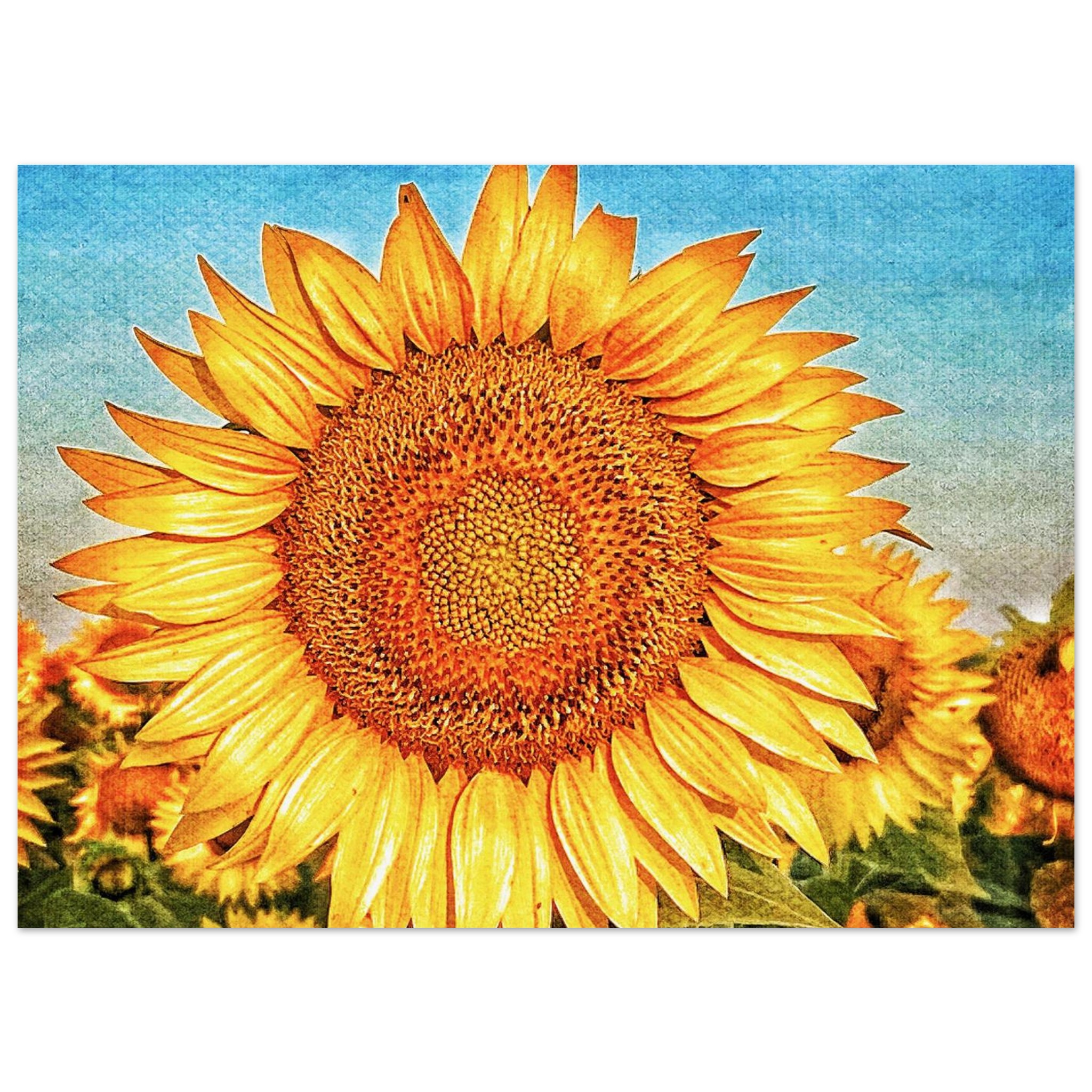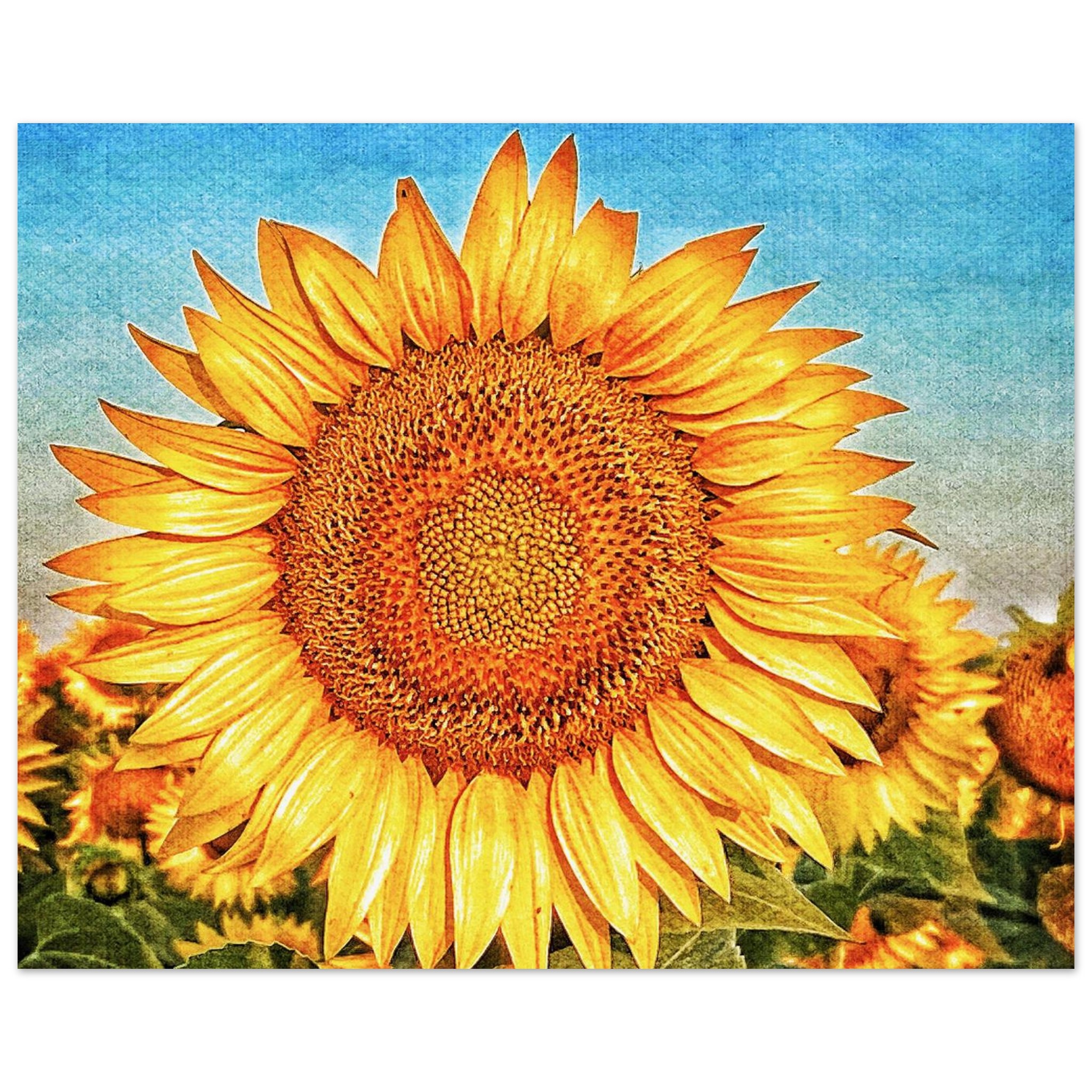 Bring the joyful energy of a sun-drenched field into your home with this stunning sunflower print. The vivid yellow petals, contrasted against a bright, textured blue sky, evoke feelings of warmth and optimism. This artwork, reminiscent of a classic oil painting, offers a timeless touch of nature’s beauty, perfect for brightening any room or office space.