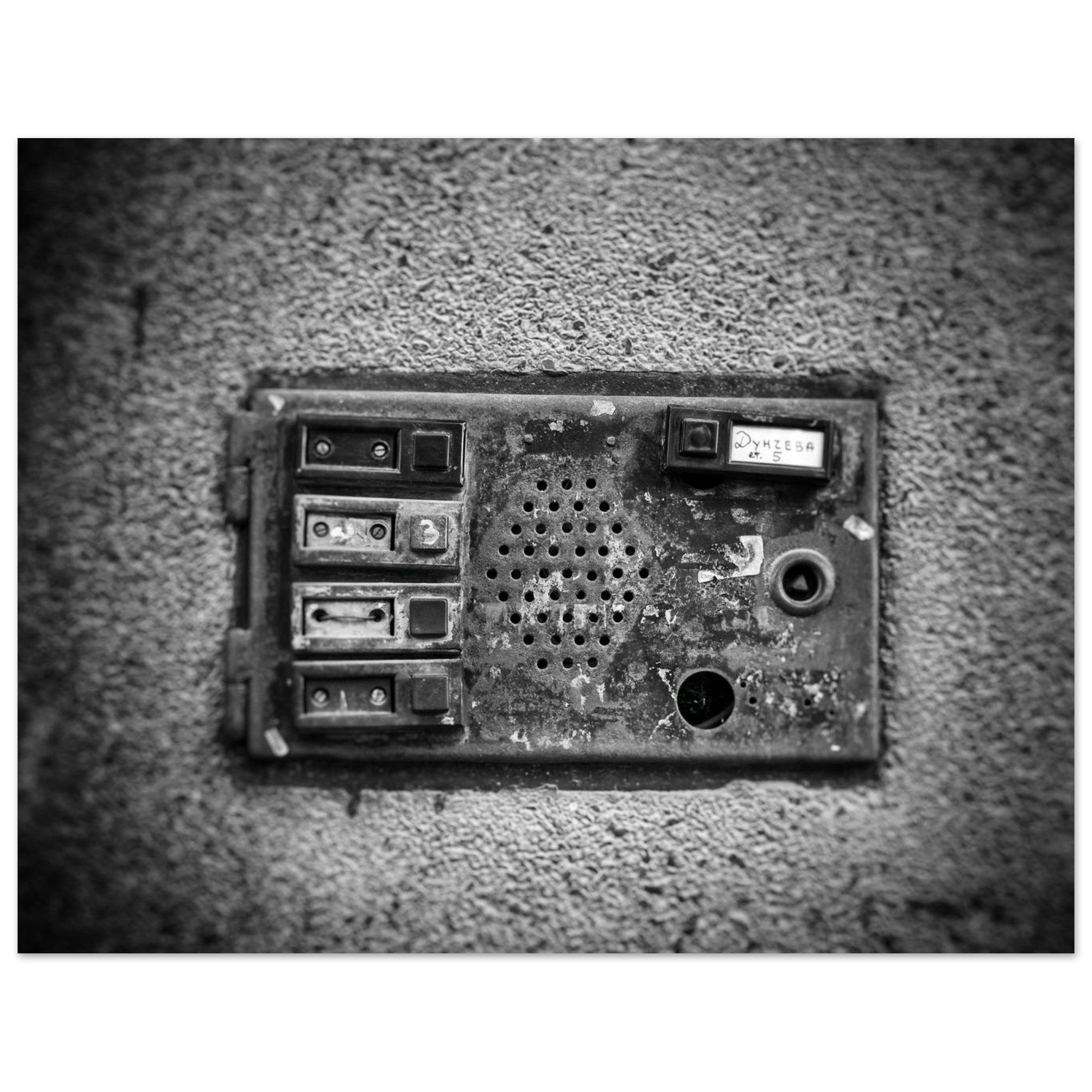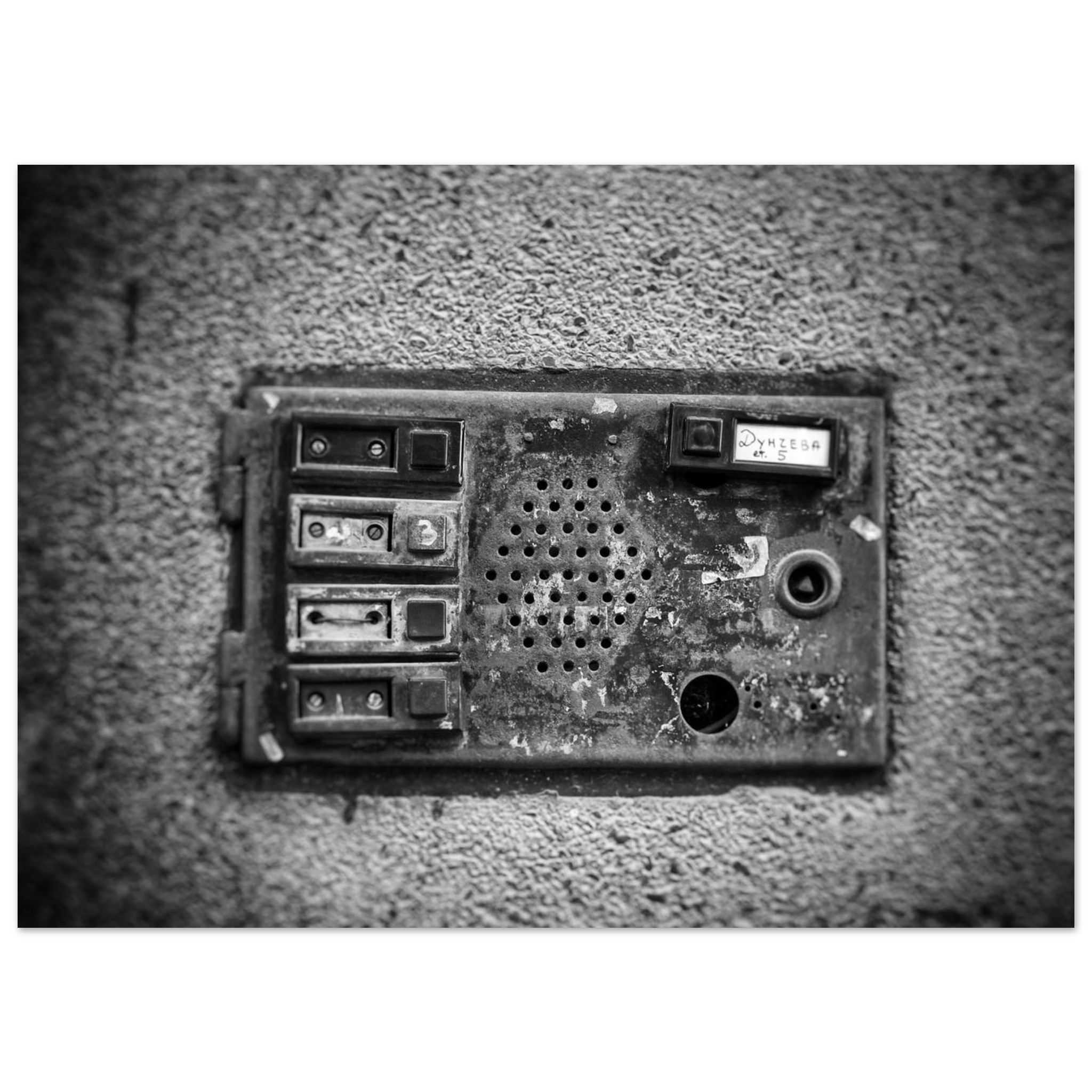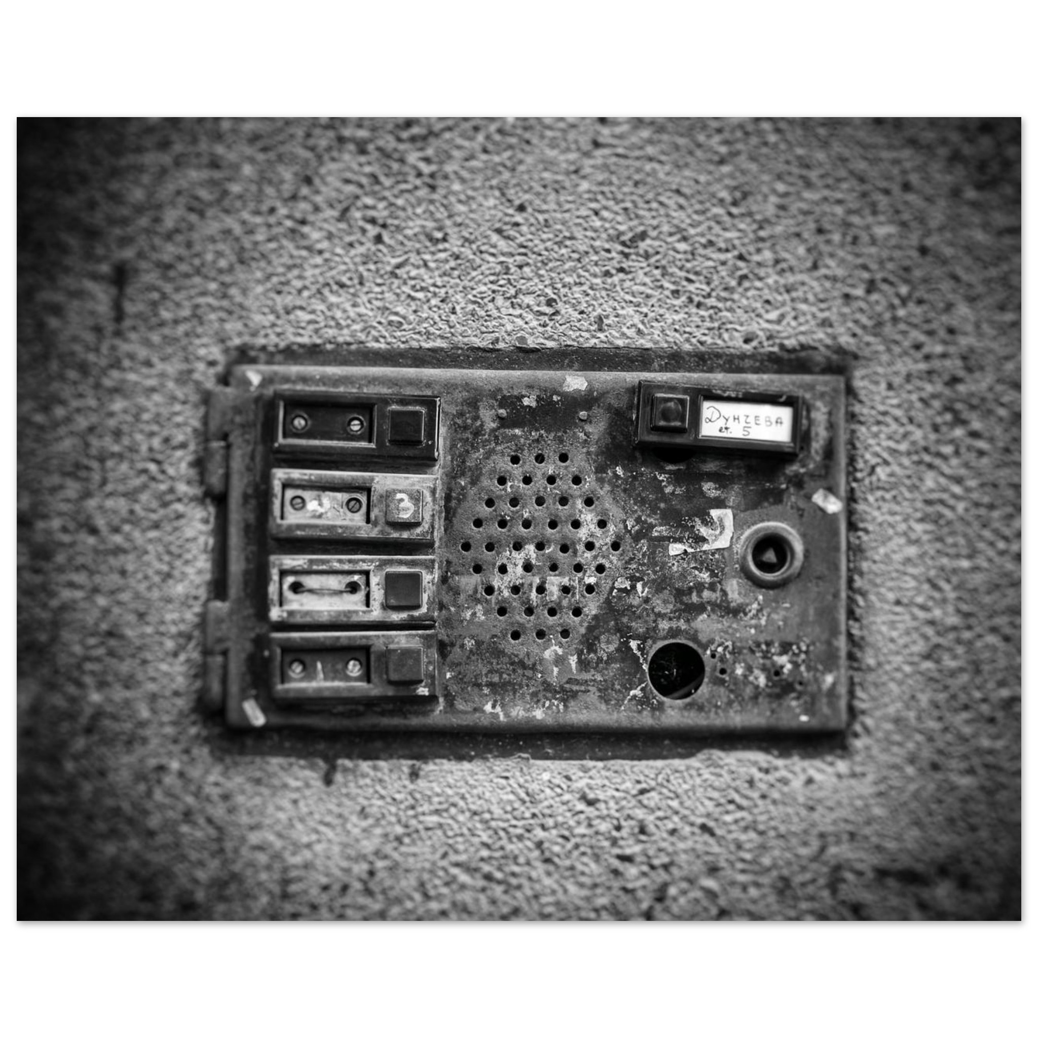 Step into a world of forgotten stories with this striking monochrome print featuring a vintage Bulgarian intercom. The raw, textured details and atmospheric black-and-white palette evoke a powerful sense of nostalgia and urban history, perfect for adding character to any space.