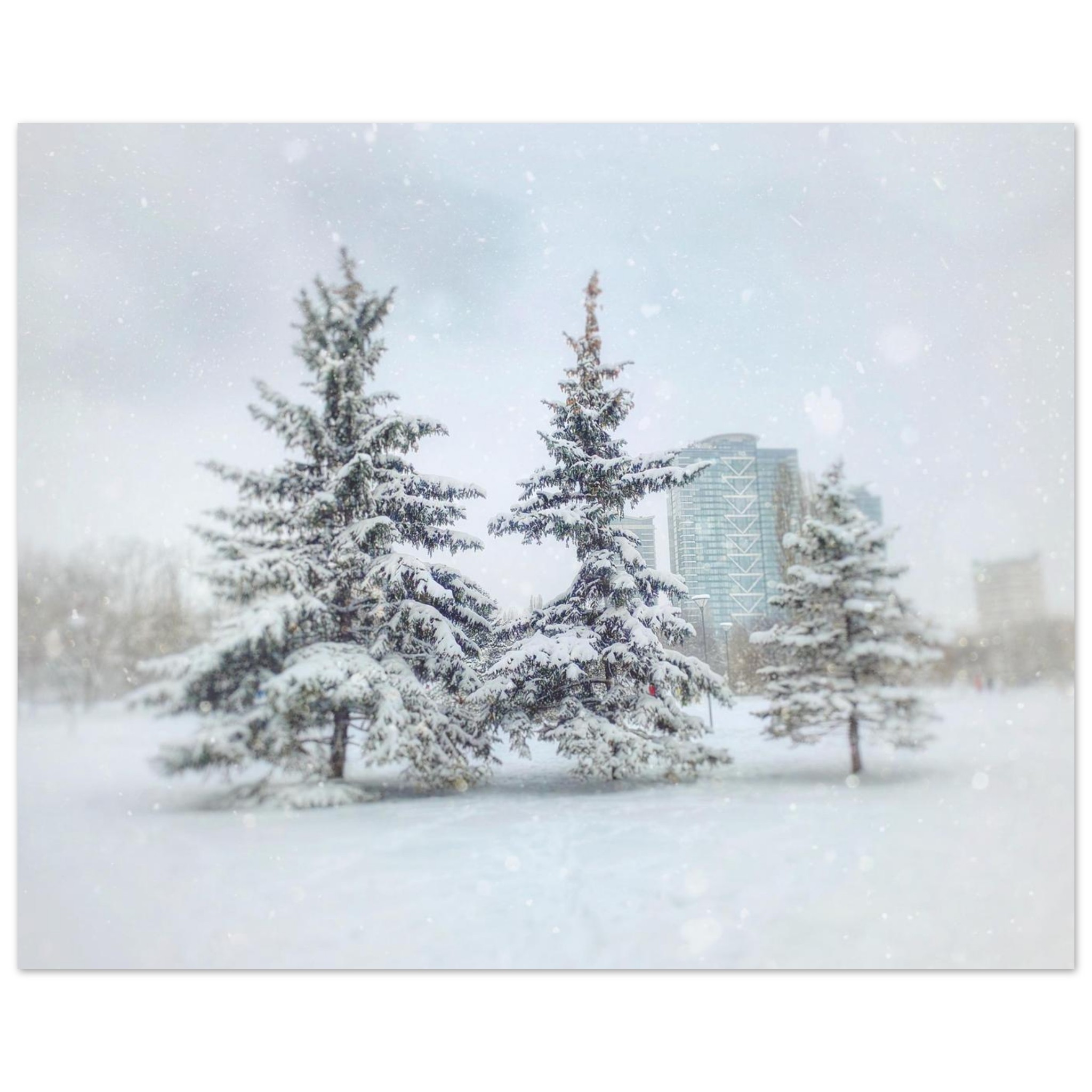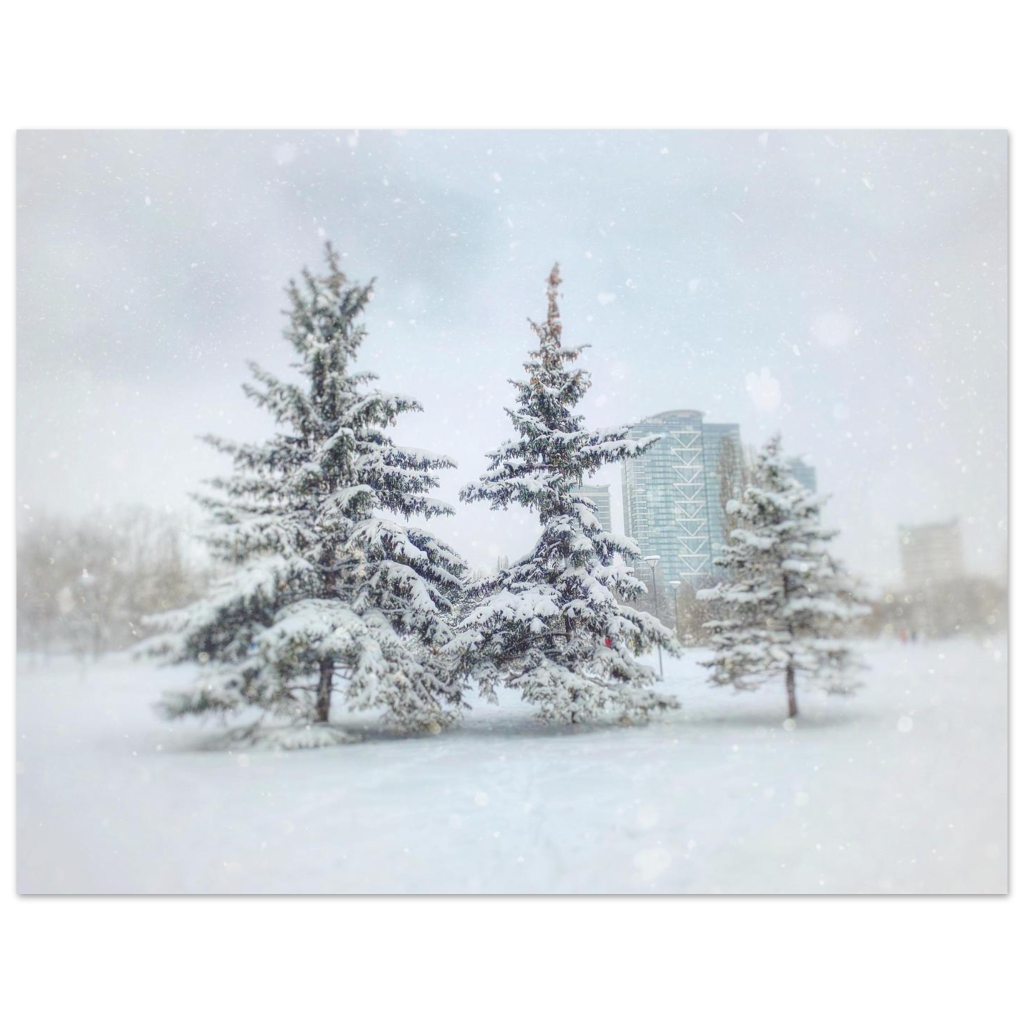 Immerse yourself in the tranquil beauty of a winter wonderland. This dreamy scene captures snow-laden evergreen trees amidst a gentle snowfall, evoking a serene and peaceful mood perfect for creating a cozy atmosphere in any room. The soft, muted color palette and ethereal quality of the image make it a captivating piece for those who appreciate the quiet magic of the colder months.